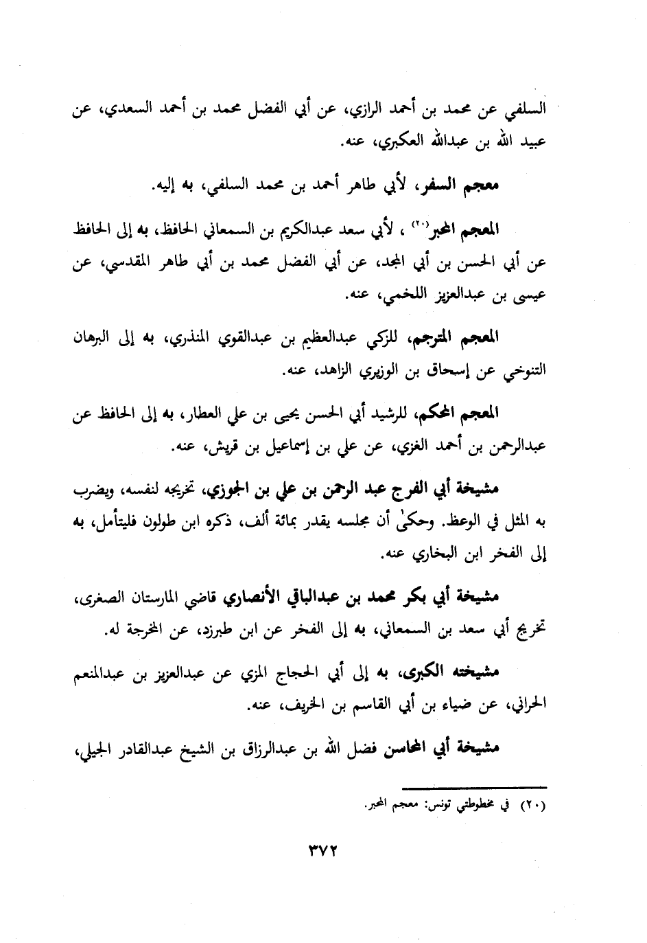 السلفي عن محمد بن احمد الرازي عن ابي الفضل محمد بن احمد السعدي عن عبيد الله بن عبد الله العكبري عنه معجم السفر لأبي طاهر احمد بن محمد السلفي به اليه المعجم المحبر لأبي سعد عبد الكريم بن السمعاني الحافظ به الي الحافظ عن ابي الحسن بن ابي المجد عن ابي الفضل محمد بن ابي طاهر المقدسي عن عيسي بن عبد العزيز اللخمي عنه. المعجم المترجم للزكي عبد العظيم بن عبد القوي المنزري به الي البرهان التنوخي عن اسحاق بن الوزيري الزاهد عنه. المعجم المحكم للرشيد ابي الحسن يحيي بن علي العطار به الي الحافظ عن عبد الرحمن بن احمد الغزي عن علي بن اسماعيل بن قريش عنه مشيخة ابي الفرج عبد الرحمن بن علي بن الجوزي تخريجه لنفسه ويضرب به المثل في الوعظ وحكي ان مجلسه يقدر بمائة الف ذكره ابن طولون فليتأمل به الي الفخر ابن البخاري عنه. مشيخة ابي بكر محمد بن عبد الباقي الأنصاري قاضي المارستان الصغري تخريج ابي سعد بن السمعاني به الي الفخر عن ابن طبرزد عن المخرجه له. مشيخته الكبري به الي ابي الحجاج المزي عن عبد العزيز بن عبد المنعم الحراني عن ضياء بن ابي القاسم بن الخر يف عنه مشيخة ابي المحاسن فضل الله بن عبد الرزاق بن الشيخ عبد القادر الجيلي