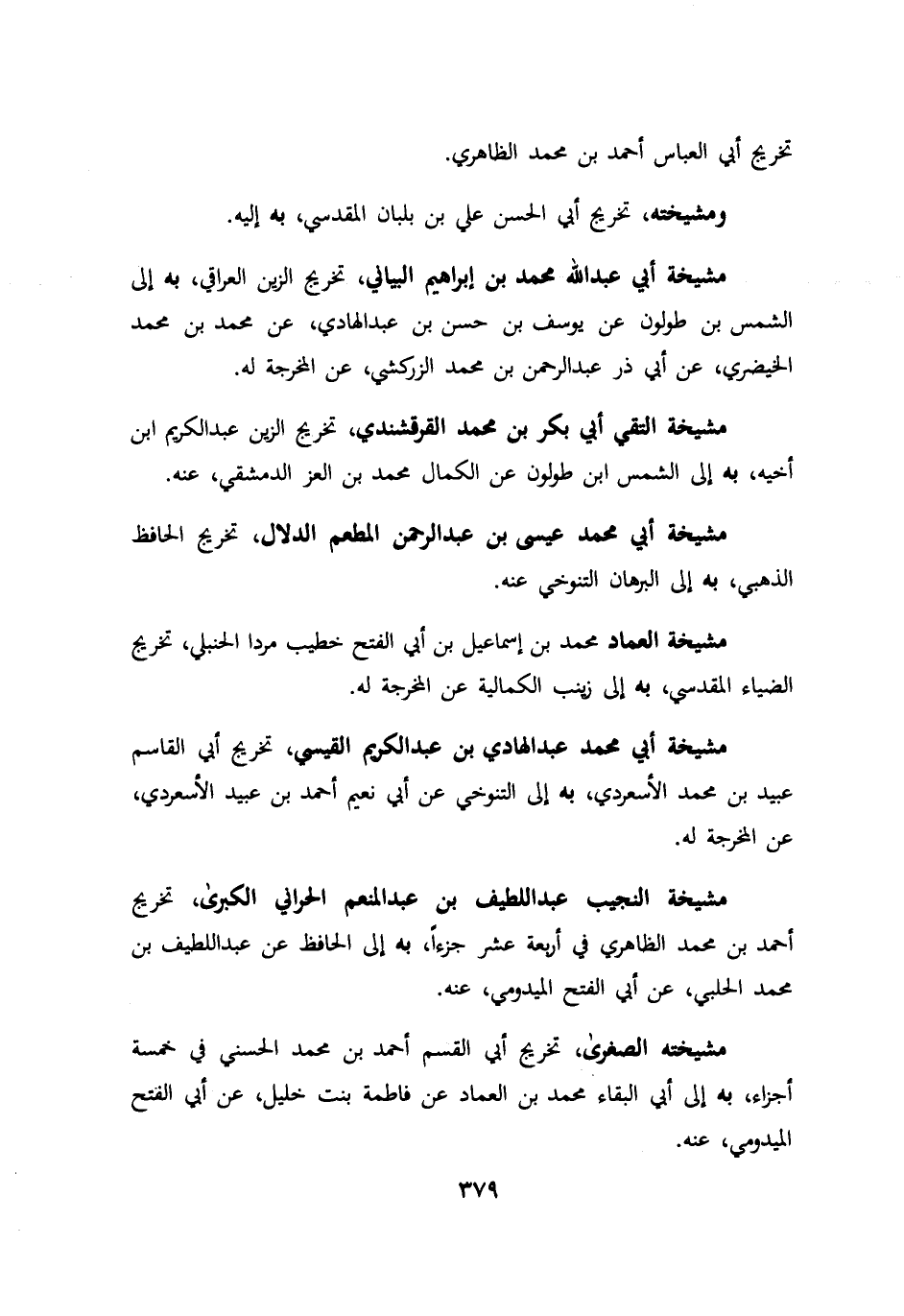 تخريج ابي العباس احمد بن محمد الظاهري ومشيخته تخريج ابي الحسن علي بن بلبان المقدسي به اليه. مشيخة ابي عبد الله محمد بن ابراهيم البياني تخريج الزين العراقي به الي الشمس بن طولون عن يوسف بن حسن بن عبد الهادي عن محمد بن محمد الخيضري عن ابي ذر عبد الرحمن بن محمد الزركشي عن المخرجة له. مشيخة التقي ابي بكر بن محمد القرقشندي تخريج الزين عبد الكريم ابن اخيه به الي الشمس ابن طولون عن الكمال محمد بن العز الدمشقي عنه. مشيخة ابي محمد عيسي بن عبد الرحمن المطعم الدلال تخريج تخريج الحافظ الذهبي به الي البرهان التنوخي عنه. مشيخة العماد محمد بن اسماعيل بن ابي الفتح خطيب مردا الحنبلي تخريج الضياء المقدسي به الي زينب الكمالية عن المخرجة له. مشيخة ابي محمد عبد الهادي بن عبد الكريم القيسي تخريج ابي القاسم عبيد بن محمد الأسعردي به الي التنوخي عن ابي نعيم احمد بن عبيد الأسعردي عن المخرجة له. مشيخة النجيب عبد اللطيف بن عبد المنعم الحراني الكبري تخريج احمد بن محمد الظاهري في اربعة عشر جزءا به الي الحافظ عن عبد الطيف بن محمد الحلبي عن ابي الفتح الميدومي عنه. مشيخته الصغري تخريج ابي القسم احمد بن محمد الحسني في خمسة اجزاء به الي ابي البقاء محمد بن العماد عن فاطمة بنت خليل عن ابي الفتح الميدومي عنه.