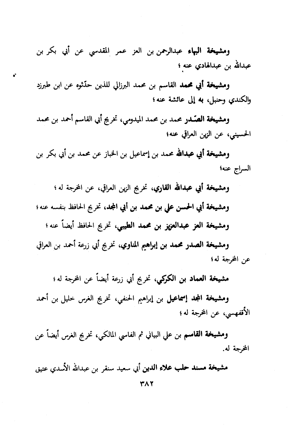 ومشيخة البهاء عبد الرحمن بن العز عمر المقدسي عن ابي بكر بن عبد الله بن عبد الهادي عنه. ومشيخة ابي محمد القاسم بن محمد البرزالي للزين حدثوه عن ابن طبرزد والكندي وحنبل به الي عائشة عنه؛ ومشيخة الصدر محمد بن محمد الميدومي تخريج ابي القاسم احمد بن محمد الحسيني عن الزين العراقي عنه. ومشيخة ابي عبد الله محمد بن اسماعيل بن الخباز عن محمد بن ابي بكر بن السراج عنه. ومشيخة ابي عبد الله القاري تخريج الزين العراقي عن المخرجة له ومشيخة ابي الحسن علي بن محمد بن ابي المجد تخريج الحافظ بنفسه عنه. ومشيخة العز عبد العزيز بن محمد الطيبي تخريج الحافظ ايضا عنه. ومشيخة الصدر محمد بن ابراهيم المناوي تخريج ابي زرعة احمد بن العراقي عن المخرجة له مشيخة العماد بن الكركي تخريج ابي زرعة ايضا عن المخرجة له ومشيخة المجد اسماعيل بن ابراهيم الحنفي تخريج الغرس خليل بن احمد الأقفهسي عن المخرجة له. ومشيخة القاسم بن علي البياني ثم الفاسي المالكي تخريج الغرس ايضا عن المخرجة له. مشيخة مسند حلب علاء الدين ابي سعيد سنقر بن عبد الله الأسدي عتيق