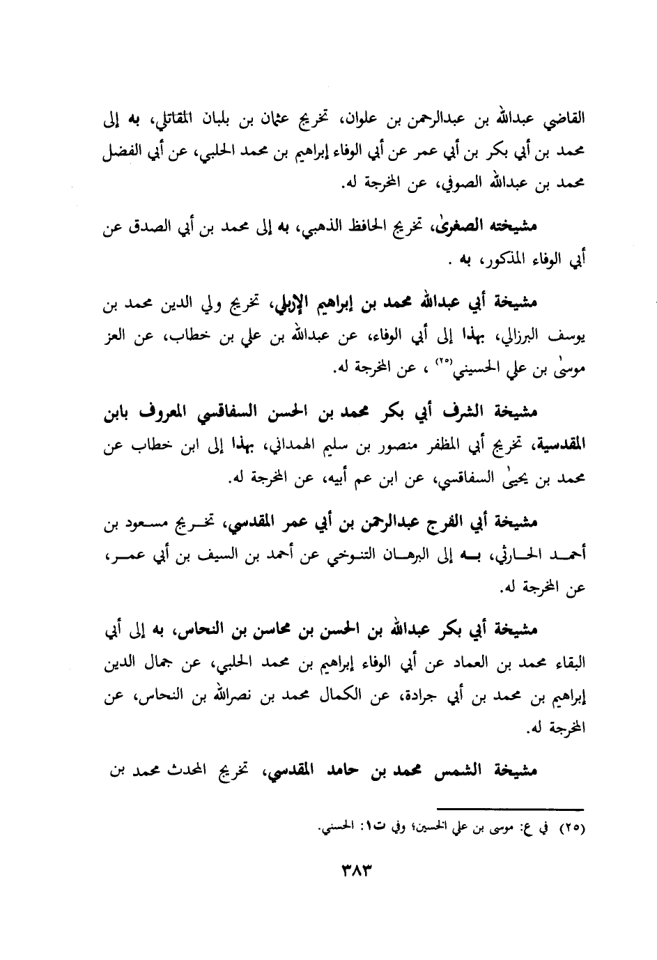 القاضي عبد الله بن عبد الرحمن بن علوان تخريج عثمان بن بلبان المقاتلي به الي محمد بن ابي بكر بن ابي عمر عن ابي الوفاء ابراهيم بن محمد الحلبي عن ابي الفضل محمد بن عبد الله الصوفي عن المخرجة له مشيخته الصغري تخريج الحافظ الذهبي به الي محمد بن ابي الصدق عن ابي الوفاء المذكور به. مشيخة ابي عبد الله محمد بن ابراهيم الإربلي تخريج ولي الدين محمد بن يوسف البرزالي بهذا الي ابي الوفاء عن عبد الله بن علي بن خطاب عن العز موسي بن علي الحسيني عن المخرجة له. مشيخة الشرف ابي بكر محمد بن الحسن السفاقسي المعروف بابن المقدسية تخريج ابي المظفر منصور بن سليم الهمداني بهذا الي ابن خطاب عن محمد بن يحيي السفاقسي عن ابن عم ابيه عن المخرجة له. مشيخة ابي الفرج عبد الرحمن بن ابي عمر المقدسي تخريج مسعود بن احمد الحارئي به الي البرهان التنوخي عن احمد بن السيف بن ابي عمر عن المخرجه له. مشيخة ابي بكر عبد الله بن الحسن بن محاسن بن النحاس به الي ابي البقاء محمد بن العماد عن ابي الوفاء ابراهيم بن محمد الحلبي عن جمال الدين ابراهيم بن محمد بن ابي جرادة عن الكمال محمد بن نصرالله بن النحاس عن المخرجة له. مشيخة الشمس محمد بن حامد المقدسي تخريج المحدث محمد بن