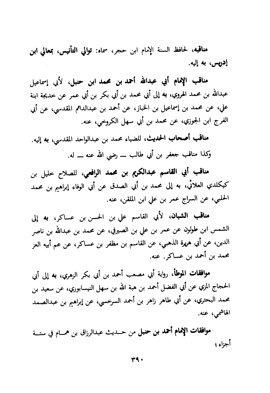 مناقبه لحافظ السنة الإمام ابن حجر سماه توالي التأنيس بمعالي ابن ادريس به اليه. مناقب الإمام عبد الله احمد بن محمد ابن حنبل لأبي اسماعيل عبد الله بن محمد الهروي به الي ابي محمد بن ابي بكر بن ابي عمر عن خديجة ابنة علي عن محمد بن اسماعيل بن الخباز عن احمد بن عبد الدائم المقدسي عن ابي الفرج ابن الجوزي عن محمد بن ابي سهل الكروخي عنه. مناقب اصحاب الحديث للضياء محمد بن عبد الواحد المقدسي به اليه وكذا مناقب جعفر بن ابي طالب – رضي الله عنه – له. مناقب ابي القاسم عبد الكريم بن محمد الرافعي للصلاح خليل بن كيكلدي العلائي به الي محمد بن ابي الصدق عن ابي الوفاء ابراهيم بن محمد الحلبي عن السراج عمر بن علي ابن الملقن عنه. مناقب الشبان لأبي القاسم علي بن الحسن بن عساكر به الي الشمس ابن طولون عن عمر بن علي بن الصيرفي عن محمد بن عبد الله بن ناصر الدين عن ابي هريرة الذهبي عن القاسم بن مظفر بن عساكر عن عم ابيه العز محمد بن احمد بن عساكر عنه. موافقات الموطأ رواية ابي مصعب احمد بن ابي بكر الزهري به الي ابي الحجاج المزي عن ابي الفضل احمد بن هبة الله بن سهل النيسابوري عن سعيد بن محمد البحتري عن ابي طاهر زاهر بن احمد السرخسي عن ابراهيم بن عبد الصمد الهاشمي عنه. موافقات الإمام احمد بن حنبل من حديث عبد الرزاق بن همام في ستة اجزاء،