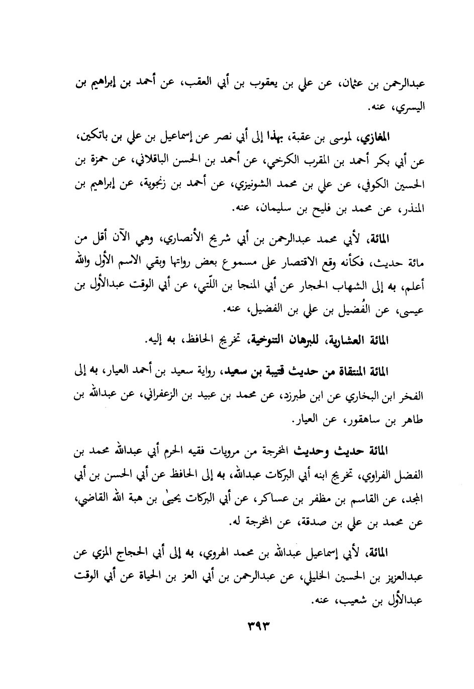 عبد ارحمن بن عثمان عن علي بن يعقوب بن ابي العقب عن احمد بن ابراهيم بن اليسري عنه. المغازي لموسي بن عقبة بهذا الي ابي نصر عن اسماعيل بن علي بن باتكين عن ابي بكر احمد بن المقرب الكرخي عن احمد بن الحسن الباقلاني عن حمزة بن الحسين الكوفي عن علي بن محمد الشونيزي عن احمد بن زنجوية عن ابراهيم بن المنذر عن محمد بن فليح بن سليمان عنه. المائة لأبي محمد عبد الرحمن بن ابي شريح الأنصاري وهي الآن اقل من مائة حديث فكأنه وقع الاقتصار علي مسموع بعض رواتها وبقي الاسم الأول والله اعلم به الي الشهاب الحجار عن ابي المنجا بن اللتي عن ابي الوقت عبد الأول بن عيسي عن الفضيل بن علي بن الفضيل عنه. المائة العشارية للبرهان التنوخية تخريج الحافظ به اليه المائة العشارية للبرهان التنوخية تخريج الحافظ به اليه المائة المنتقاه من حديث قتيبة بن سعيد رواية سعيد بن احمد العيار به الي الفخر ابن البخاري عن ابن طبرزد عن محمد بن عبيد بن الزعفراني عن عبد الله بن طاهر بن ساهقور عن العيار المائة حديث وحديث المخرجة من مرويات فقيه الحرم ابي عبد الله محمد بن الفضل الفراوي تخريج ابنه ابي بركات عبد الله به الي الحافظ عن ابي الحسن بن ابي المجد عن القاسم بن مظفر بن عساكر عن ابي البركات يحيي بن هبة الله القاضي عن محمد بن علي بن صدقة عن المخرجة له المائة لأبي اسماعيل عبد الله بن محمد الهروي به الي ابي الحجاج المزي عن عبد العزيز بن الحسين الخليلي عن عبد الرحمن بن ابي العز بن الحياة عن ابي الوقت عبد الأول بن شعيب عنه.