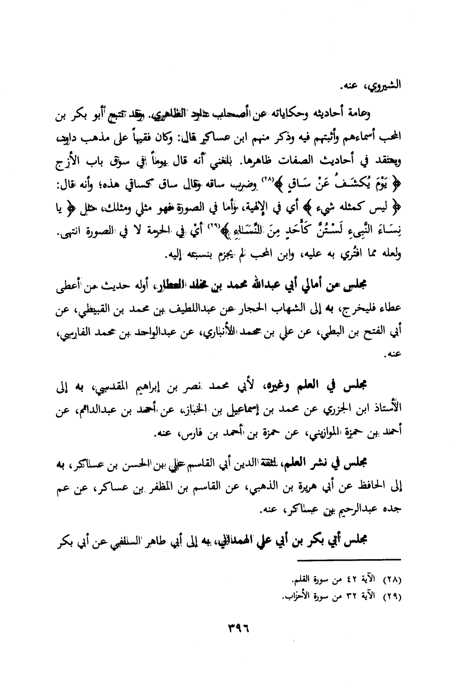 الشيروي عنه. وعامة احاديثه وحكاياته عن اصحاب داود الظاهري وقد تتبع ابو بكر بن المحب اسماءهم واثبتهم فيه وذكر منهم ابن عساكر قال: وكان فقيها علي مذهب داود ويعتقد في احاديث الصفات ظاهرها بلغني انه قال يوما في سوق باب الأزج {يوم يكشف عن ساق} وضرب ساقه وقال ساق كساقي هذه وانه قال {ليس كمثله شئ} اي في الإلهية واما في الصورة فهو مثلي ومثلك مثل {يا نساء النبي لستن كأحد من النساء} اي في الحرمة ولا في الصورة انتهي ولعله مما افتري به عليه وابن المحب لم يجزم بنسبته اليه. مجلس من امالي ابي عبد الله محمد بن مخلد العطار واوله حديث من اعطي عطاء فليخرج به الي الشهاب الحجار عن عبد اللطيف بن محمد بن القبيطي عن ابي الفتح بن البطي عن علي بن محمد الأنباري عن عبد الواحد بن محمد الفارسي عنه. مجلس في العلم وغيره لأبي محمد نصر بن ابراهيم المقدسي به الي الأستاذ ابن الجزري عن محمد بن اسماعيل بن الخباز عن احمد بن عبد الدائم عن احمد بن حمزة الموازيني عن حمزة بن احمد بن فارس عنه. مجلس في نشر العلم لثقة الدين ابي القاسم علي بن الحسن بن عساكر به الي الحافظ عن ابي هريرة بن الذهبي عن القاسم بن المظفر بن عساكر عن عم جده عبد الرحيم بن عساكر عنه. مجلس ابي بكر بن ابي علي الهمداني به الي ابي طاهر السلفي عن ابي بكر