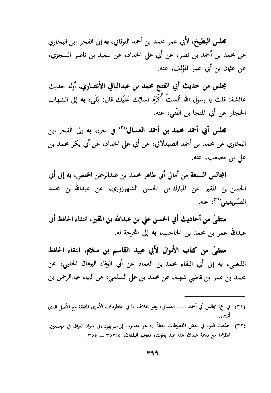 مجلس البطيخ لأبي عمر محمد بن احمد التوقاني به الي الفخر ابن البخاري عن محمد بن احمد بن نصر عن ابي علي الحداد عن سعيد بن ناصر السجزي عن عثمان بن ابي عمر المؤلف عنه. مجلس من حديث ابي الفتح محمد بن عبد الباقي الأنصاري اوله حديث عائشة قلت يارسول الله الست اكرم نسائك عليك قال بلي به الي الشهاب الحجار عن ابي المنجا بن اللتي عنه. مجلس ابي احمد بن محمد بن احمد العسال في جزء به الي الفخر ابن البخاري عن محمد بن احمد الصيدلاني عن ابي علي الحداد عن ابي بكر محمد بن علي بن مصعب عنه. المجالس السبعة من امالي ابي طاهر محمد بن عبد الرحمن المخلص به الي ابي الحسن بن المقير عن المبارك بن الحسن الشهرزوري عن عبد الله بن محمد الصريفني عنه. منتقي من احاديث ابي الحسن علي بن عبد الله بن المقير انتقاء الحافظ ابي عبد الله عمر بن محمد بن الحاجب به الي المخرجة له منتقي من كتاب الأموال لأبي عبيد القاسم بن سلام انتقاء الحافظ الذهبي به الي ابي البقاء محمد بن العماد عن ابي الوفاء البرهان الحلبي عن محمد بن عمر بن قاضي شهبة عن محمد بن علي السلمي عن البهاء عبد الرحمن بن
