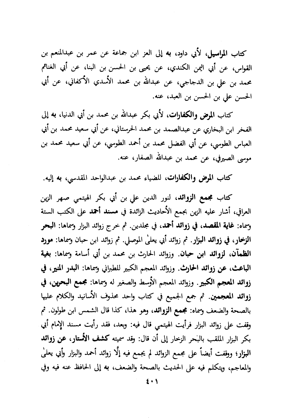 كتاب المراسيل لأبي داود به الي العز ابن جماعة عن عمر بن عبد المنعم بن القواس عن ابي اليمن الكندي عن يحيي بن الحسن بن البنا عن ابي الغنائم محمد بن علي بن الدجاجي عن عبد الله بنمحمد الاسدي الاكفاني عن ابي الحسن علي بن الحسن بن العبد عنه كتاب المرض والكفارات لأبي بكر عبد الله بن محمد بن ابي الدنيا به الي الفخر ابن البخاري عن عبد الصمد بن محمد الحرستاني عن ابي سعيد محمد بن ابي العباس الطوسي عن ابي الفضل محمد بن احمد الطوسي عن ابي سعيد محمد بن موسي الصيرفي عن محمد بن عبد الله الصفار عنه كتاب المرض والكفارات للضياء محمد بن عبد الواحد المقدسي به اليه كتاب مجمع الزوائد لنور الدين علي بن ابي بكر الهيتمي صهر الزين العراقي اشار عليه الزين بجمع الاحاديث الزائدة في مسند احمد علي الكتب الستة وسمكاه غاية المقصد في زوائد احمد في مجلدين ثم خرج زوائد البزار وسماها البحر الزخار في زوائد البزار ثم زوائد ابي يعلي الموصلي ثم زوائد ابن حبان وسماها مورد الظمآن لزوائد ابن حبان وزائد الحارث بن محمد بن ابي اسامة وسماها بغية الباعث عن زوائد الحارث وزوائد المعجم الكبير للطبراني وسماها البدر المنير في زوائد المعجم الكبيروزوائد المعجم الاوسط والصغير له وسماها مجمع البحرين في زوائد المعجمين ثم جمع الجميع في كتاب واحد محذوف الاسانيد والكلام عليها بالصحة والضعف وسماه مجمع الزوائد وهو هذا كذا قال الشمس ابن طولون ثم وقفت علي زوائد فرأيت الهيتمي قال فيه وبعد فقد رأيت مسند الامام ابي بكر البزار الملقب بالبحر الزخار الي ان قال وقد سميته كشف الاستار عن زوائد البزار ووقفت ايضا علي مجمع الزوائد لم يجمع فيه الا زوائد احمد والبزار وابي يعلي والمعاجم وبتكلم فيه علي الحديث بالصحة والضعف به الي الحافظ عنه فيه وفي