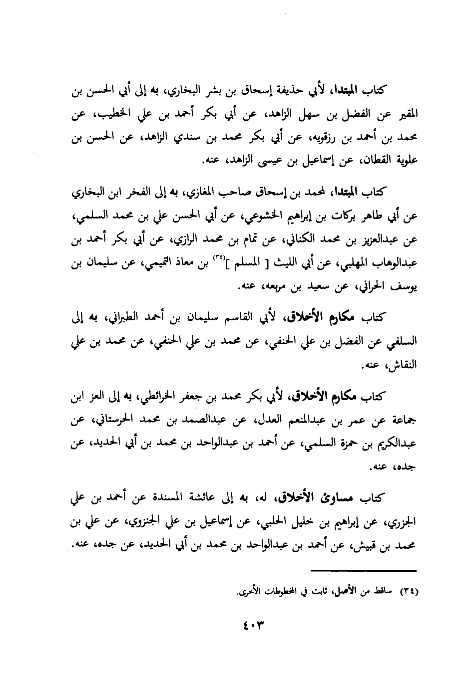 كتاب المبتدا لأبي حذيفة بن بشر البخاري به الي ابي الحسن بن المقير عن الفضل بن سهل الزاهد عن ابي بكر احمد بن علي الخطيب عن محمد بن احمد بن رزقويه عن ابي بكر محمد بن سندي الزاهد عن الحسن بن علوية القطان عن اسماعيل بن عيسي الزاهد عنه كتاب المبتدا لمحمد بن اسحاق صاحب المغازي به الي الفخر ابن البخاري عن ابي طاهر بركات بن ابراهيم الخشوعي عن ابي الحسن علي بن محمد السلمي عن عبد العزيز بن محمد الكناني عن تمام بن محمد الرازي عن ابي بكر احمد بن عبد الوهاب المهلبي عن ابي الليث المسلم بن معاذ التميمي عن سليمان بن يوسف الحراني عن سعيد بن مربعه عنه كتاب مكارم الاخلاق لأبي القاسم سليمان بن احمد الطبراني به الي السلفي عن الفضل بن علي الحنفي عن محمد بن علي الحنفي عن محمد بن علي النقاش عنه كتاب مكارم الاخلاق لأبي بكر محمد بن جعفر الخرائطي به الي العز ابن جماعة عن عمر بن عبد المنعم العدل عن عبد الصمد بن محمد الحرستاني عن عبد الكريم بن حمزة السلمي عن احمد بن عبد الواحد بن محمد بن ابي الحديد عن جده عنه كتاب مساوئ الاخلاق له به الي عائشة المسندة عن احمد بن علي الجزري عن ابراهيم بن خليل الحلبي عن اسماعيل بن الجنزوري عن علي بن محمد بن قبيش عن احمد بن احمد بن عبد الواحد بن محمد بن ابي الحديد عن جده عنه
