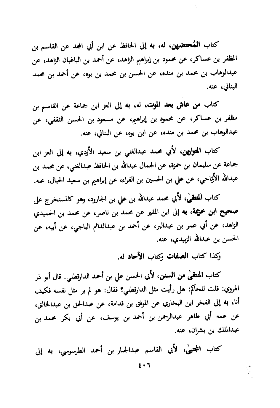 كتاب المحتضرين له به الي الحافظ عن ابن ابي المجد عن القاسم بن المظفر بن عساكر عن محمود بن ابراهيم الزاهد عن احمد بن الباغبان الزاهد عن عبد الوهاب بن محمد بن منده عن الحسن بن محمد بن بوه عن احمد بن محمد البناني عنه كتاب من عاش بعد الموت له به الي العز ابن جماعة عن القاسم بن مظفر بن عساكر عن محمود بن ابراهيم عن مسعود بن الحسن الثقفي عن عبد الوهاب بن محمد بن منده عن ابن بوه عن البناني عنه كتاب المتوارين لأبي محمد عبد الغني بن سعيد الازدي به الي العز ابن جماعة عن سليمان بن حمزة عن الجمال عبد الله بن الحافظ عبد الغني عن محمد بن عبد الله الارتاحي عن علي بن الحسين بن الفراء عن ابراهيم بن سعيد الحبال عنه كتاب المنتقي لأبي محمد عبد الله بن علي بن الجارود وهو كالمستخرج علي صحيح ابن خزيمة به الي ابن المقير عن محمد بن ناصر عن محمد بن الحميدي الزاهد عن ابي عمر بن عبد البر عن احمد بن عبد الدائم الباجي عن ابيه عن الحسن بن عبد الله الزبيدي عنه وكذا كتاب الصفات وكتاب الاحاد له كتاب المنتقي من السنن لأبي الحسن بن احمد الدارقطني قال ابو ذر الهروي قلت للحاكم هل رأيت مثل الدارقطني؟ فقال هو لم ير مثل نفسه فكيف انا به الي الفخر ابن البخاري عن الموفق بن قدامة عن عبد الحق بن عبد الخالق عن عمه ابي طاهر عبد الرحمن بن احمد بن يوسف عن ابي بكر محمد بن عبد الملك بن بشران عنه كتاب المجتبي لأبي القاسم عبد الجبار بن احمد الطرسوسي به الي