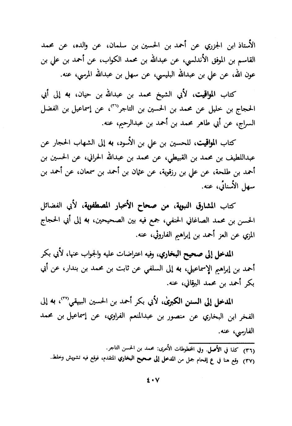 الاستاذ ابن الجزري عن احمد بن الحسين بن سلمان عن والده عن محمد القاسم بن الموفق الاندلسي عن عبد الله بن محمد الكواب عن احمد بن علي بن عون الله عن علي بن عبد الله البليسي عن سهل بن عبد الله المرسي عنه كتاب المواقيت لأبي الشيخ محمد بن عبد الله بن حبان به الي ابي الحجاج بن خليل عن محمد بن الحسين بن التاجر عن اسماعيل بن الفضل السراج عن ابي طاهر محمد بن احمد بن عبد الرحيم عنه كتاب المواقيت للحسين بن علي بن الاسود به الي الشهاب الحجار عن عبد اللطيف بن محمد بن القبيطي عن محمد بن عبد الله الحراني عن الحسين بن احمد طلحة عن علي بن رزقوية عن عثمان بن احمد بن سمعان عن احمد بن سهل الاسناني عنه كتاب المشارق النبوية من صحاح الاخبار المصطفوية لأبي الفضائل الحسن بن محمد الصاغاني الحنفي جمع فيه بين الصحيحين به الي ابي الحجاج المزي عن العز احمد بن ابراهيم الفاروثي عنه المدخل الي صحيح البخاري وفيه اعتراضات عليه والجواب عنها لأبي بكر احمد بن ابراهيم الاسماعيلي به الي السلفي عن ثابت بن محمد بن بندار عن ابي بكر احمد بن محمد البرقاني عنه المدخل الي السنن الكبري لأبي بكر احمد بن الحسين البيهقي به الي الفخر ابن البخاري عن منصور بن عبد المنعم الفراوي عن اسماعيل بن محمد الفارسي عنه