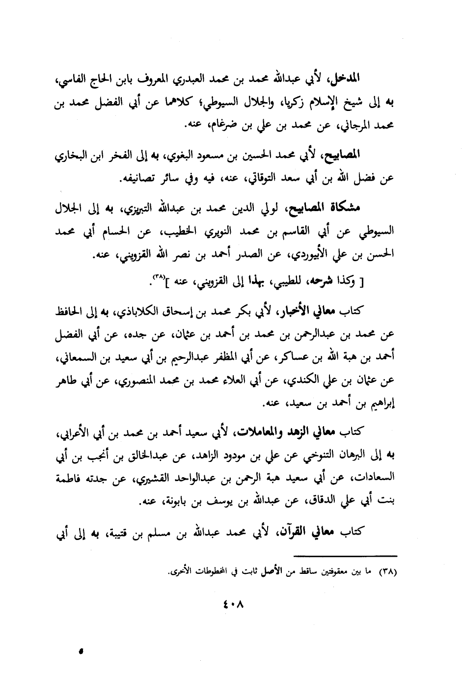 المدخل لأبي عبد الله محمد بن محمد العبدري المعروف بابن الحاج الفاسي به الي شيخ الاسلام زكريا والجلال السيوطي كلاهما عن ابي الفضل محمد بن محمد المرجاني عن محمد بن علي بن ضرغام عنه المصابيح لأبي محمد الحسين بن مسعود البغوي به الي الفخر ابن البخاري عن فضل الله بن ابي سعد التوقاتي فيه وفي سائر تصانيفه مشكاة المصابيح لولي الدين محمد بن عبد الله التبريزي به الي الجلال السيوطي عن ابي القاسم بن محمد النويري الخطيب عن الحسام ابي محمد الحسن بن علي الابيوردي عن الصدر احمد بن نصر الله القزويني عنه وكذا شرحه للطيبي بهذا الي القزويني عنه كتاب معاني الاخبار لأبي بكر محمد بن اسحاق الكلاباذي به الي الحافظ عن محمد بن عبد الرحمن بن محمد بن احمد بن عثمان عن جده عن ابي الفضل احمد بن هبة الله بن عساكر عن ابي المظفر عبد الرحيم بن ابي سعيد بن السمعاني عن عثمان بن علي الكندي عن ابي العلاء محمد بن محمد المنصوري عن ابي طاهر ابراهيم بن احمد بن سعيد عنه كتاب معاني الزهد والمعاملات لأبي سعيد احمد بن محمد بن ابي الاعرابي به الي البرهان التنوخي عن علي بن مودود الزاهد عن عبد الخالق بن انجب بن ابي السعادات عن ابي سعيد هبة الرحمن بن عبد الواحد القشيري عن جدته فاطمة بنت ابي علي الدقاق عن عبد الله بن يوسف بن بابونة عنه كتاب معاني القرآن لأبي محمد عبد الله بن مسلم بن قتيبة به الي ابي