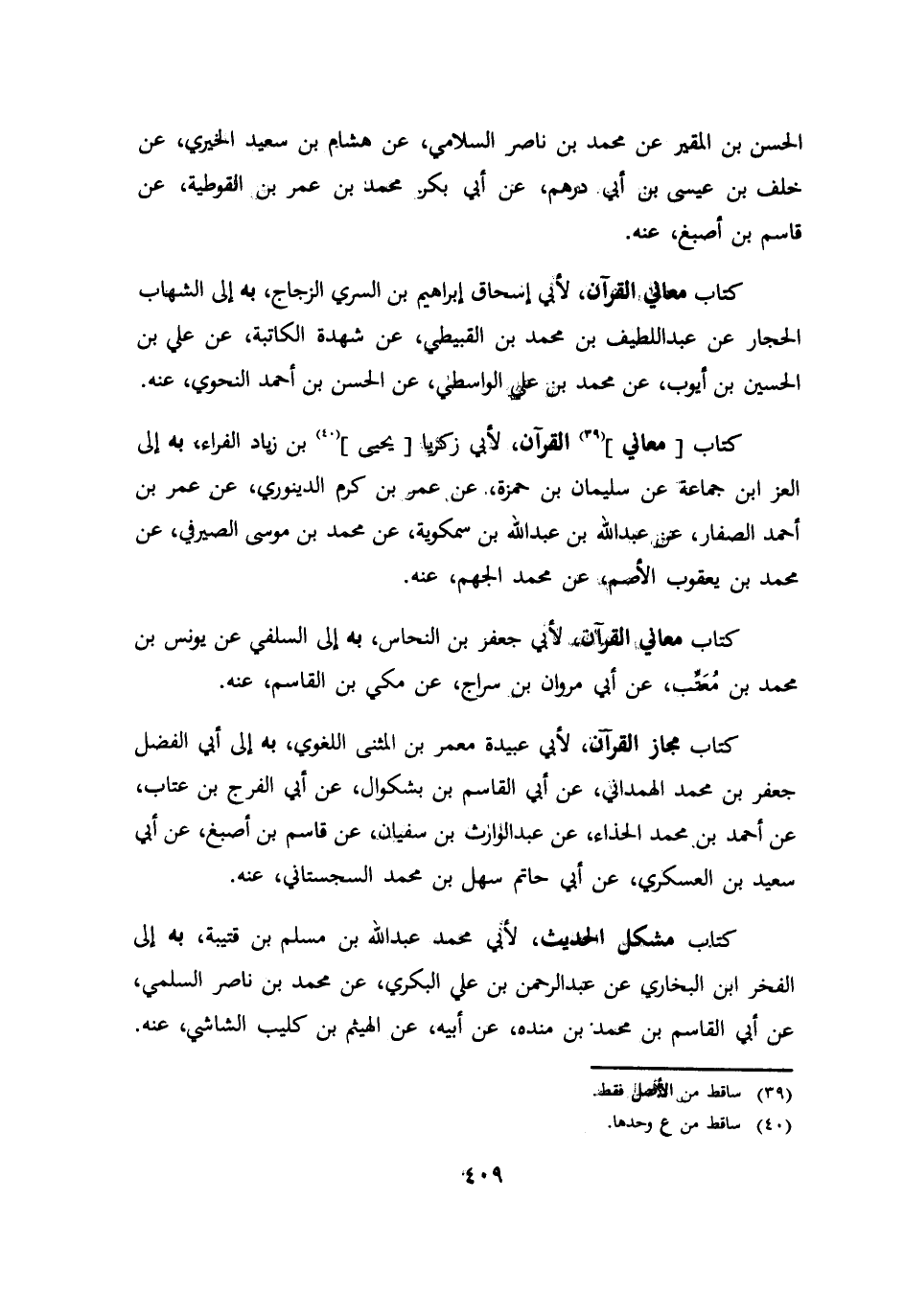 الحسن بن المقير عن محمد بن ناصر السلامي عن هشام بن سعيد الخيري عن خلف بن عيسي بن ابي درهم عن ابي بكر محمد بن عمر بن القوطية عن قاسم بن اصبغ عنه كتاب معاني القرآن لأبي اسحاق ابراهيم بن السري الزجاج به الي الشهاب الحجار عن عبد اللطيف بن محمد بن القبيطي عن شهدة الكاتبة عن علي بن الحسين بن ايوب عن محمد بن علي الواسطي عن الحسن بن احمد النحوي عنه كتاب معاني القرآن لأبي زكريا يحيي بن زياد الفراء به الي العز ابن جماعة عن سليمان بن حمزة عن عمر بن كرم الدينوري عن عمر بن احمد الصفار عن عبد الله بن عبد الله بن سمكوية عن محمد بن موسي الصيرفي عن محمد بن يعقوب الاصم عن محمد الجهم عنه كتاب معاني القرآن لأبي جعفر بن النحاس به الي السلفي عن يونس بن محمد بن معتب عن ابي مروان بن سراج عن مكي بن القاسم عنه كتاب مجاز القرآن لأبي عبيدة معمر بن المثني اللغوي به الي ابي الفضل جعفر بن محمد الهمداني عن ابي القاسم بن بشكوال عن ابي الفرج بن عتاب عن احمد بن محمد الحذاء عن عبد الوارث بن سفيان عن قاسم بن اصبغ عن ابي سعيد بن العسكري عن ابي حاتم سهل بن محمد بن محمد السجستاني عنه كتاب مشكل الحديث لأبي محمد عبد الله بن مسلم بن قتيبة به الي الفخر ابن البخاري عن عبد الرحمن بن علي البكري عن محمد بن ناصر السلمي عن ابي القاسم بن محمد بن منده عن ابيه عن الهيثم بن كليب الشاشي عنه