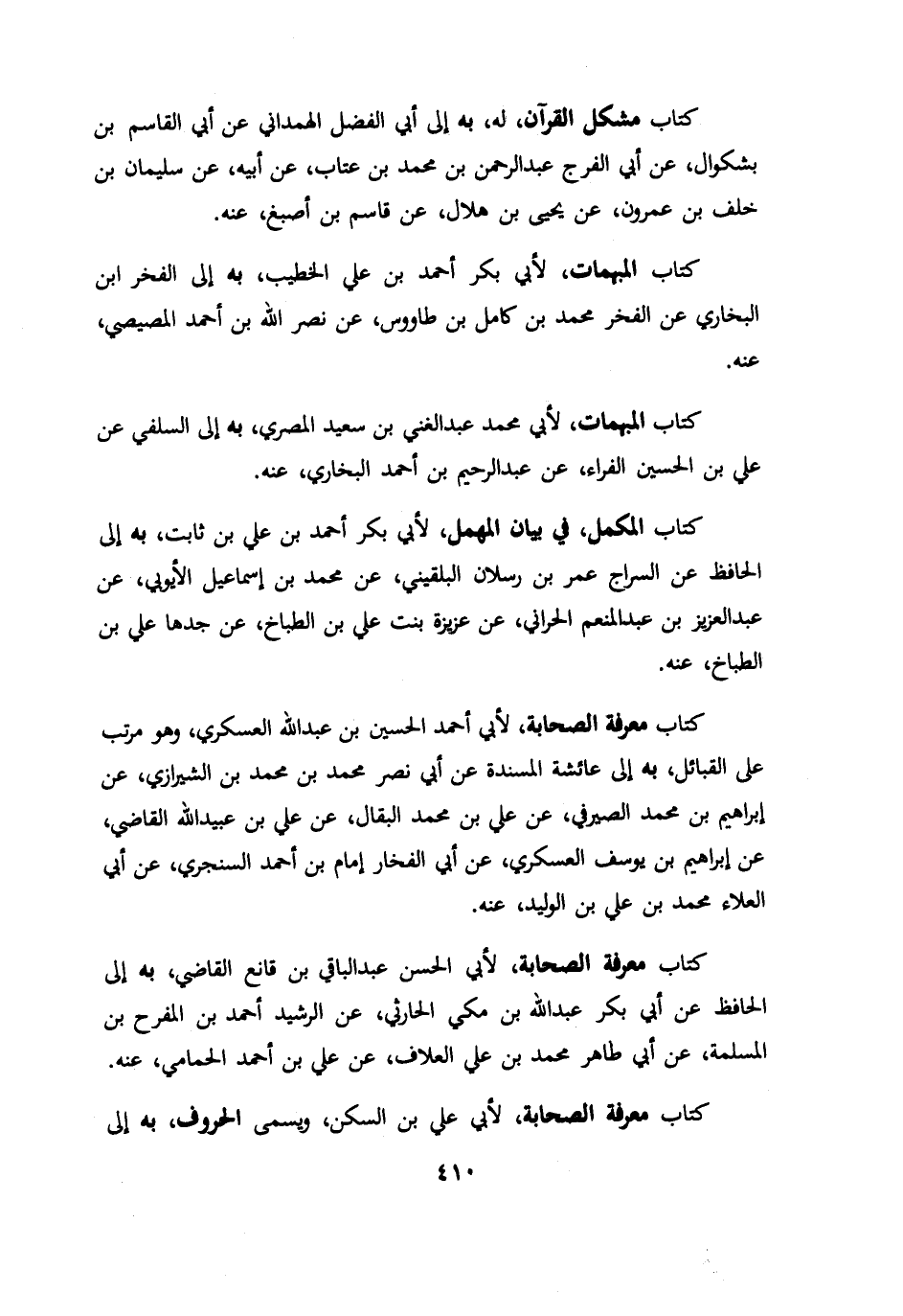 كتاب مشكل القرآن به الي ابي الفضل الهمداني عن ابي القاسم بن بشكوال عن ابي الفرج عبد الرحمن بن محمد بن عتاب عن ابيه عن سليمان بن خلف بن عمرون عن يحيي بن هلال عن قاسم بن اصبغ عنه كتاب المبهمات لأبي بكر احمد بن علي الخطيب به الي الفخر ابن البخاري عن الفخر محمد بن كامل بن طاووس عن نصر الله بن احمد المصيصي عنه كتاب المبهمات لأبي محمد عبد الغني بن سعيد المصري به الي السلفي عن علي بن الحسين الفراء عن عبد الرحيم بن احمد البخاري عنه كتاب المكمل في بيان المهمل لأبي بكر احمد بن علي بن ثابت به الي الحافظ عن السراج عمر بن رسلان البلقيني عن محمد بن اسماعيل الايوبي عن عبد العزيز بن عبد المنعم الحراني عن عزيزة بنت علي بن الطباخ عن جدها علي بن الطباخ عنه كتاب معرفة الصحابة لأبي احمد الحسين بن عبد الله العسكري وهو مرتب علي القبائل به الي عائشة المسندة عن ابي نصر محمد بن محمد بن الشيرازي عن ابراهيم بن محمد الصيرفي عن علي بن محمد البقال عن علي بن عبيد الله القاضي عن ابراهيم بن يوسف العسكري عن ابي الفخار امام بن احمد السنجري عن ابي العلاء محمد بن علي بن الوليد عنه كتاب معرفة الصحابة لأبي الحسن عبد الباقي بن قانع القاضي به الي الحافظ عن ابي بكر عبد الله بن مكي الحارثي عن الرشيد احمد بن الفرج بن المسلمة عن ابي طاهر محمد بن علي العلاف عن علي بن احمد الحمامي عنه كتاب معرفة الصحابة لأبي علي بن السكن ويسمي الحروف به الي