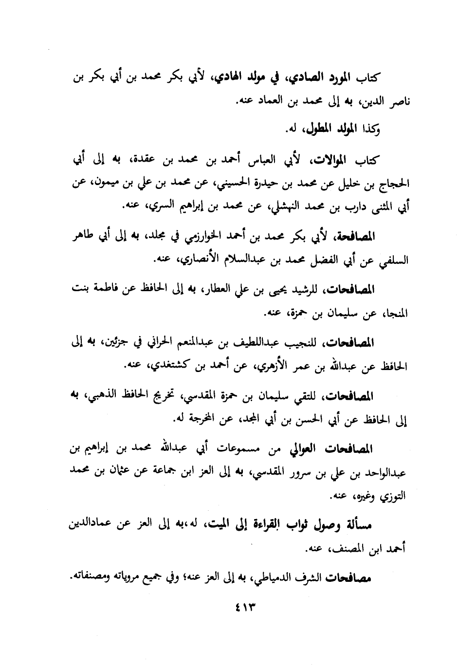كتاب المورد الصادي في مولد الهادي لأبي بكر محمد بن ابي بكر بن ناصر الدين به الي محمد بن العماد عنه وكذا المولد المطول له كتاب الموالات لأبي العباس احمد بن محمد بن عقدة به الي ابي الحجاج بن خليل عن محمد بن حيدرة الحسيني عن محمد بن علي بن ميمون عن ابي المثني دارب بن محمد النهشلي عن محمد بن ابراهيم السري عنه المصافحة لأبي بكر محمد بن احمد الخوارزمي في مجلد به الي ابي طاهر السلفي عن ابي الفضل محمد بن عبد السلام الانصاري عنه المصافحات للرشيد يحيي بن علي العطار به الي الحافظ عن فاطمة بنت المنجا عن سليمان بن حمزة عنه المصافحات للنجيب عبد اللطيف بن عبد المنعم الحراني في جزئين به الي الحافظ عن عبد الله بن عمر الازهري عن احمد بن كشتغدي عنه المصافحات للتقي سليمان بن حمزة المقدسي تخريج الحافظ الذهبي به الي الحافظ عن ابي الحسن بن ابي المجد عن المخرجة له المصافحات العوالي من مسموعات ابي عبد الله محمد بن ابراهيم بن عبد الواحد بن علي بن سرور المقدسي به الي العز ابن جماعة عن عثمان بن محمد التوزي وغيره عنه مسألة وصول ثواب القراءة الي الميت له به الي العز عن عماد الدين احمد ابن المصنف عنه مصافحات الشرف الدمياطي به الي العز عنه وفي جميع مروياته ومصنفاته