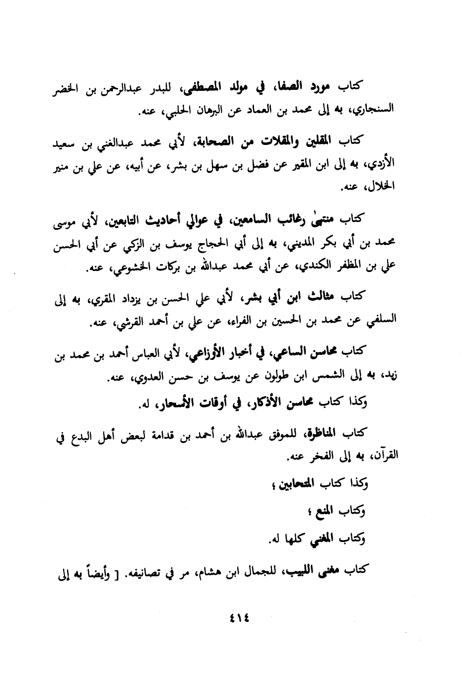 كتاب مورد الصفا في مولد المصطفي للبدر عبد الرحمن بن الخضر السنجاري به الي محمد بن العماد عن البرهان الحلبي عنه كتاب المقلين والمقلات من الصحابة لأبي محمد عبد الغني بن سعيد الازدي به الي ابن المقير عن فضل بن سهل بن بشر عن ابيه عن علي بن منير الخلال عنه كتاب منتهي رغائب السامعين في عوالي احاديث التابعين لأبي موسي محمد بن ابي بكر المديني به الي ابي الحجاج يوسف بن الزكي عن ابي الحسن علي بن المظفر الكندي عن ابي محمد عبد الله بن بركات الخشوعي عنه كتاب مثالث ابن ابي بشر لأبي علي الحسن بن يزداد المقري به الي السلفي عن محمد بن الحسين بن الفراء عن علي بن احمد القرشي عنه كتاب محاسن الساعي في اخبار الاوزاعي لأبي العباس احمد بن محمد بن زيد به الي الشمس ابن طولون عن يوسف بن حسن العدوي عنه وكذا كتاب محاسن الاذكار في اوقات الاسحار له كتاب المناظرة للموفق عبد الله بن احمد بن قدامة لبعض اهل البدع في القرآن به الي الفخر عنه وكذا كتاب المتحابين وكتاب المنع وكتاب المغني كلها له كتاب مغني اللبيب للجمال ابن هشام مر في تصانيفه وايضا به اليه