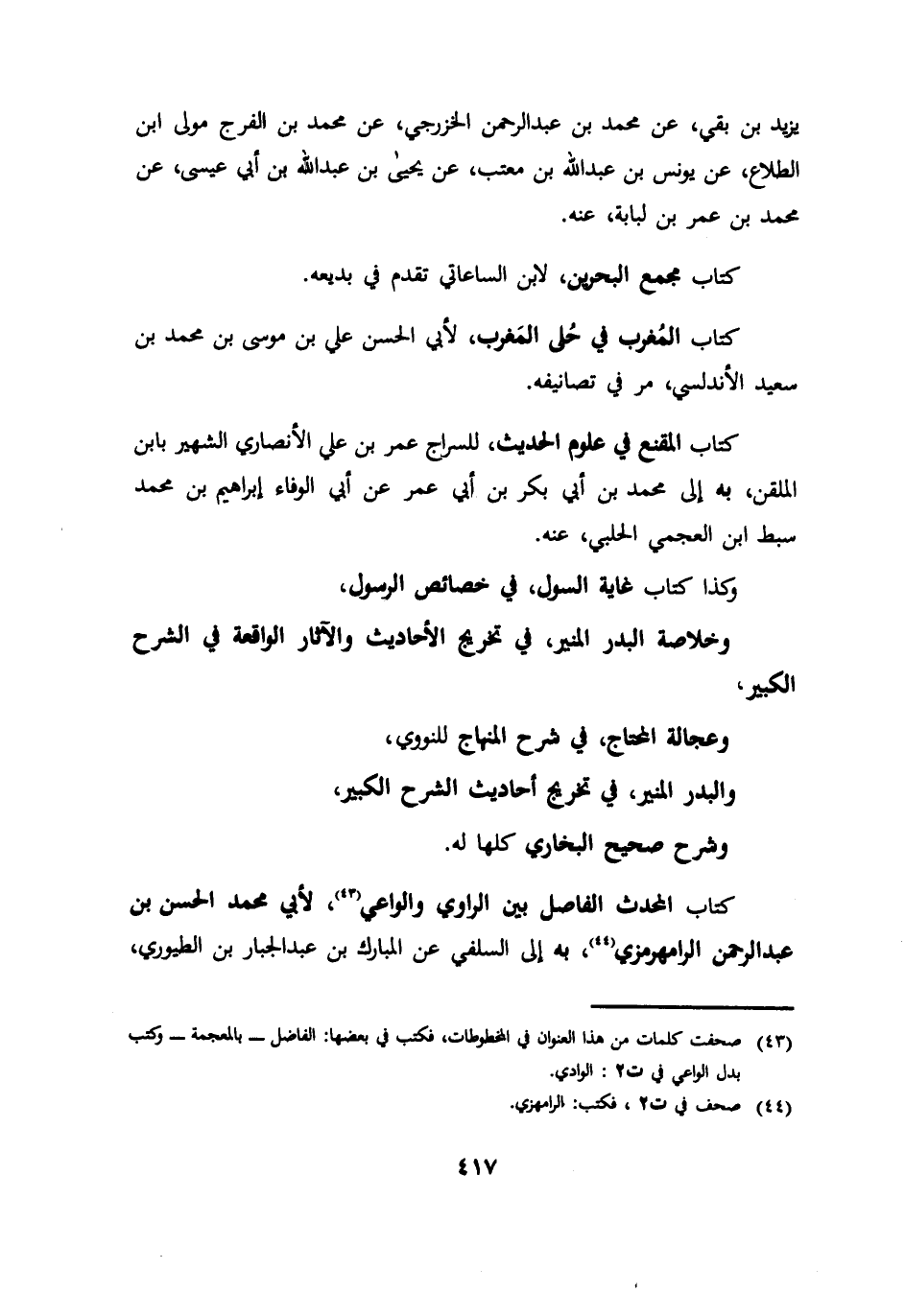 يزيد بن بقي عن محمد بن عبد الرحمن الخزرجي عن محمد بن الفرج مولي ابن الطلاع عن يونس بن عبد الله بن معتب عن يحيي بن عبد الله بن ابي عيسي عن محمد بن عمر بن لبابة عنه كتاب مجمع البحرين لابن الساعاتي تقدم في بديعة كتاب المغرب في حلي المغرب لأبي الحسن علي بن موسي بن محمد بن سعيد الاندلسي مر في تصانيفه كتاب المقنع في علوم الحديث للسراج عمر بن علي الانصاري الشهير بابن الملقن به الي محمد بن ابي بكر بن ابي عمر عن ابي الوفاء ابراهيم بن محمد سبط ابن العجمي الحلبي عنه وكذا كتاب غاية السول في خصائص الرسول وخلاصة البدر المنير في تخريج الاحاديث والاثار الواقعة في الشرح الكبير وعجالة المحتاج في شرح المنهاج للنووي والبدر المنير في تخريج احاديث الشرح الكبير وشرح صثحيح البخاري كلها له كتاب المحدث الفاصل بين الراوي والواعي لأبي محمد الحسن بن عبد الرحمن الرامهرمزي به الي السلفي عن المبارك بن عبد الجبار بن الطيوري