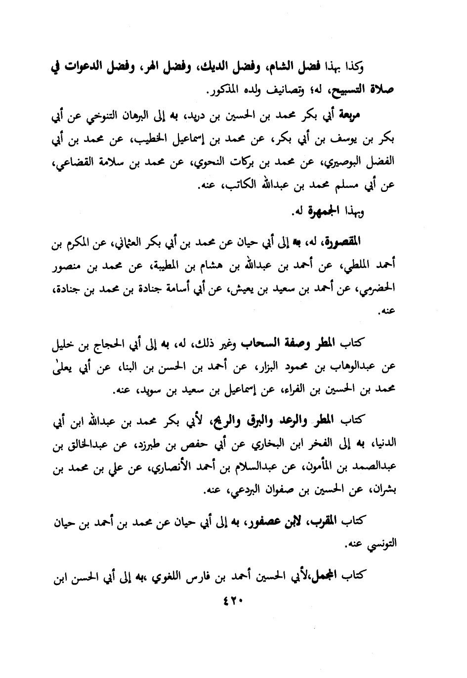 وكذا بهذا فضل الشام وفضل الديك وفضل الهر وفضل الدعوات في صلاة التسبيح له وتصانيف ولده المذكور مربعة ابي بكر محمد بن الحسين بن دريد به الي البرهان التنوخي عن ابي بكر بن يوسف بن ابي بكر عن محمد بن اسماعيل الخطيب عن محمد بن ابي الفضل البوصيري عن محمد بن بركات النحوي عن محمد بن سلامة القضاعي عن ابي مسلم محمد بن عبد الله الكاتب عنه وبهذا الجمهرة له المقصورة له به الي ابي حيان عن محمد بن ابي بكر العثماني عن المكرم بن احمد الملطي عن احمد بن عبد الله بن هشام بن المطيبة عن محمد بن منصورالحضرمي عن احمد بن سعيد بن يعيش عن ابي اسامة جنادة بن محمد بن جنادة عنه كتاب المطر وصفة السحاب وغير ذلك له به الي ابي الحجاج بن خليل عن عبد الوهاب بن محمود البزار عن احمد بن الحسن بن البنا عن ابي يعلي محمد بن الحسين بن الفراء عن اسماعيل بن سعيد بن سويد عنه كتاب المطر والرعد والبرق والريح لأبي بكر محمد بن عبد الله ابن ابي الدنيا به الي الفخر ابن البخاري عن ابي حفص بن طبرزد عن عبد الخالق بن عبد الصمد بن المأمون عن عبد السلام بن احمد الانصاري عن علي بن محمد بن بشران عن الحسين بن صفوان البردعي عنه كتاب المقرب لابن عصفور به الي ابي حيان عن محمد بن احمد بن حيان التونسي عنه كتاب المجمل لأبي الحسين احمد بن فارس اللغوي به الي ابي الحسن ابن