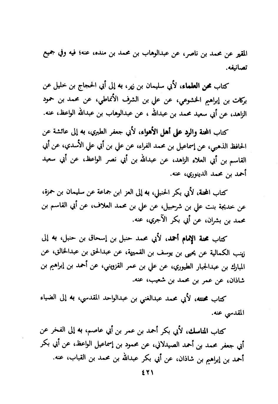 المقير عن محمد بن ناصر عن عبد الوهاب بن محمد بن منده عنه وفيه وفي جميع تصانيفه كتاب محن العلماء لأبي سليمان بن زبر به الي ابي الحجاج بن خليل عن بركات بن ابراهيم الخشوعي عن علي بن الشرف الانماطي عن محمد بن حمود الزاهد عن ابي سعيد محمد بن عبد الله عن عبد الوهاب بن عبد الله الواعظ عنه كتاب المحنة والرد علي اهل الاهواء لأبي جعفر الطبري به الي عائشة عن الحافظ الذهبي عن اسماعيل بن محمد الفراء عن علي بن ابي علي الاسدي عن ابي القاسم بن ابي العلاء الزاهد عن عبد الله بن ابي نصر الواعظ عن ابي سعيد احمد بن محمد الدينوري عنه كتاب المحنة لأبي بكر الحنبلي به الي العز ابن جماعة عن سليمان بن حمزة عن خديجة بنت علي بن شرحبيل عن علي بن محمد العلاف عن ابي القاسم بن محمد بن بشران عن ابي بكر الاجري عنه كتاب محنة الامام احمد لأبي محمد حنبل بن اسحاق بن حنبل به الي زينب الكمالية عن يحيي بن يوسف بن القميرية عن عبد الحق بن عبد الخالق عن المبارك بن عبد الجبار الطيوري عن علي بن عمر القزويني عن احمد بن ابراهيم بن شاذان عن عمر بن محمد بن شعيب عنه كتاب محنته لأبي محمد عبد الغني بن عبد الواحد المقدسي به الي الضياء المقدسي عنه كتاب المناسك لأبي بكر احمد بن عمر بن ابي عاصم به الي الفخر عن ابي جعفر محمد بن احمد الصيدلاني عن محمود بن اسماعيل الواعظ عن ابي بكر احمد بن ابراهيم بن شاذان عن ابي بكر عبد الله بن محمد بن القباب عنه