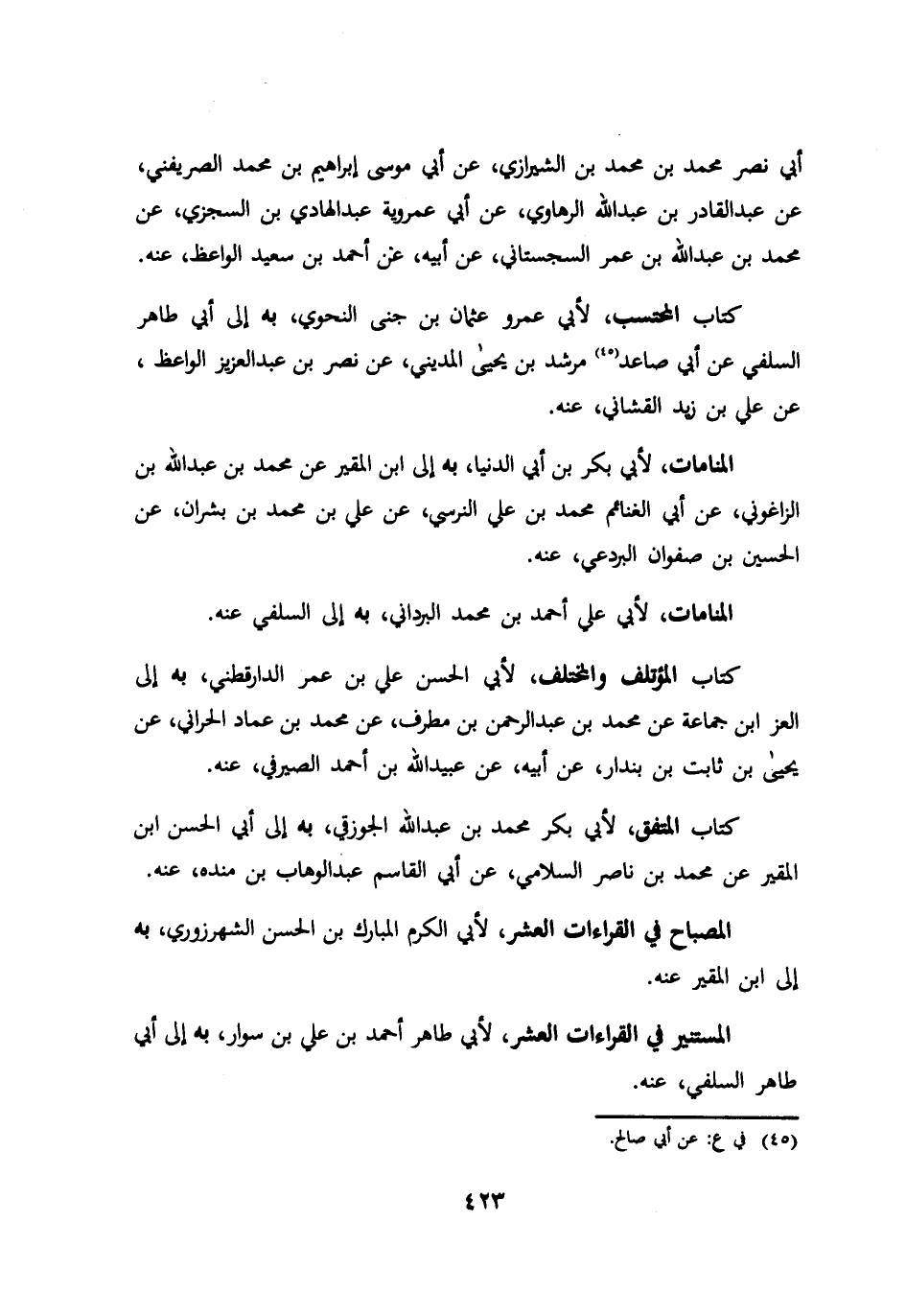 ابي نصر محمد بن محمد بن الشيرازي عن ابي موسي ابراهيم بن محمد الصريفني عن عبد القادر بن عبد الله الرهاوي عن ابي عمروية عبد الهادي بن السجزي عن محمد بن عبد الله بن عمر السجستاني عن ابيه عن احمد بن سعيد الواعظ عنه كتاب المحتسب لأبي عمرو عثمان بن جني النحوي به الي ابي طاهر السلفي عن بي صاعد مرشد بن يحيي المديني عن نصر بن عبد العزيز الواعظ عن علي بن زيد القشاني عنه المنامات لأبي بكر بن ابي الدنيا به الي ابن المقير عن محمد بن عبد الله بن الزاغوني عن ابي الغنائم محمد بن علي النرسي عن علي بن محمد بن بشران عن الحسين بن صفوان البردعي عنه المنامات لأبي علي احمد بن محمد البرداني به الي السلفي عه كتاب المؤتلف والمختلف لأبي الحسن علي بن عمر الدارقطني به الي العز ابن جماعة عن محمد بن عبد الرحمن بن مطرف عن محمد بن عماد الحراني عن يحيي بن ثابت بن بندار عن ابيه عن عبيد الله بن احمد الصيرفي عنه كتاب المتفق لأبي بكر محمد بن عبد الله الجوزقي به الي ابي الحسن ابن المقير عن محمد بن ناصر السلامي عن ابي القاسم عبد الوهاب بن منده عنه المصباح في القراءات العشر لأبي الكرم المبارك بن الحسن الشهرزوري به الي ابن المقير عنه المستنير في القراءات العشر لأبي طاهر احمد بن علي بن سوار به الي ابي طاهر السلفي عنه