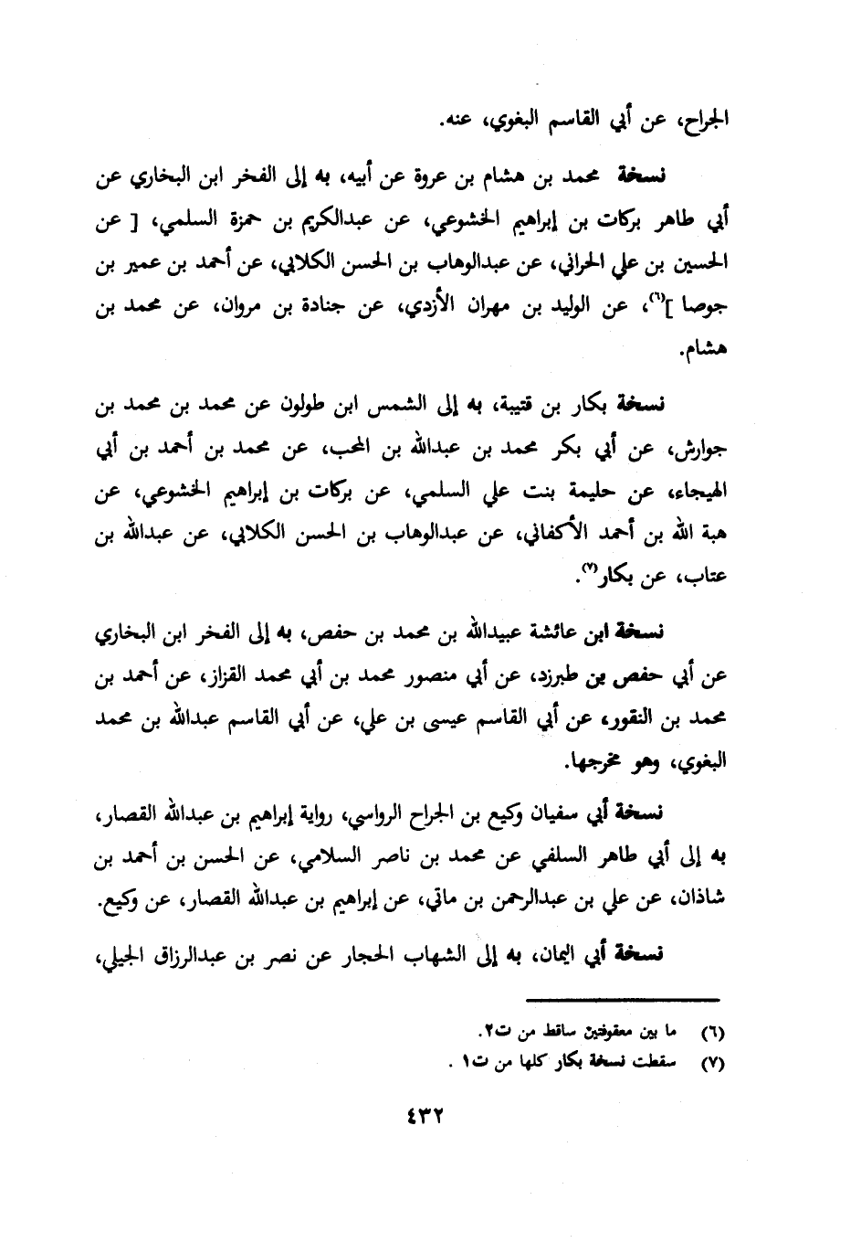 الجراح عن ابي القاسم البغوي عنه نسخة محمد بن هشام بن عروة عن ابيه به الي الفخر ابن البخاري عن ابي طاهر بركات بن ابراهيم الخشوعي عن عبد الكريم بن حمزة السلمي عن الحسين بن علي الحراني عن عبد الوهاب بن الحسن الكلابي عن احمد بن عمير بن جوصا عن الوليد بن مهران الازدي عن جنادة بن مروان عن محمد بن هشام نسخة بكار بن قتيبة به الي الشمس ابن طولون عن محمد بن محمد بن جوارش عن ابي بكر محمد بن عبد الله بن المحب عن محمد بن احمد بن ابي الهيجاء عن حليمة بنت علي السلمي عن بركات بن ابراهيم الخشوعي عن هبة الله بن احمد الاكفاني عن عبد الوهاب بن الحسن الكلابي عن عبد الله بن عتاب عن بكار نسخة ابن عائشة عبيد الله بن محمد بن حفص به الي الفخر ابن البخاري عن ابي حفص بن طبرزد عن ابي منصور محمد بن ابي محمد القزاز عن احمد بن محمد بن النقور عن ابي القاسم عيسي بن علي عن ابي القاسم عبد الله بن محمد البغوي وهو مخرجها نسخة ابي سفيان وكيع بن الجراح الرواسي رواية ابراهيم بن عبد الله القصار به الي ابي طاهر السلفي عن محمد بن ناصر السلامي عن الحسن بن احمد بن شاذان عن علي بن عبد الرحمن بن ماتي عن ابراهيم بن عبد الله القصار عن وكيع نسخة ابي اليمان به الي الشهاب الحجار عن نصر بن عبد الرزاق الجيلي