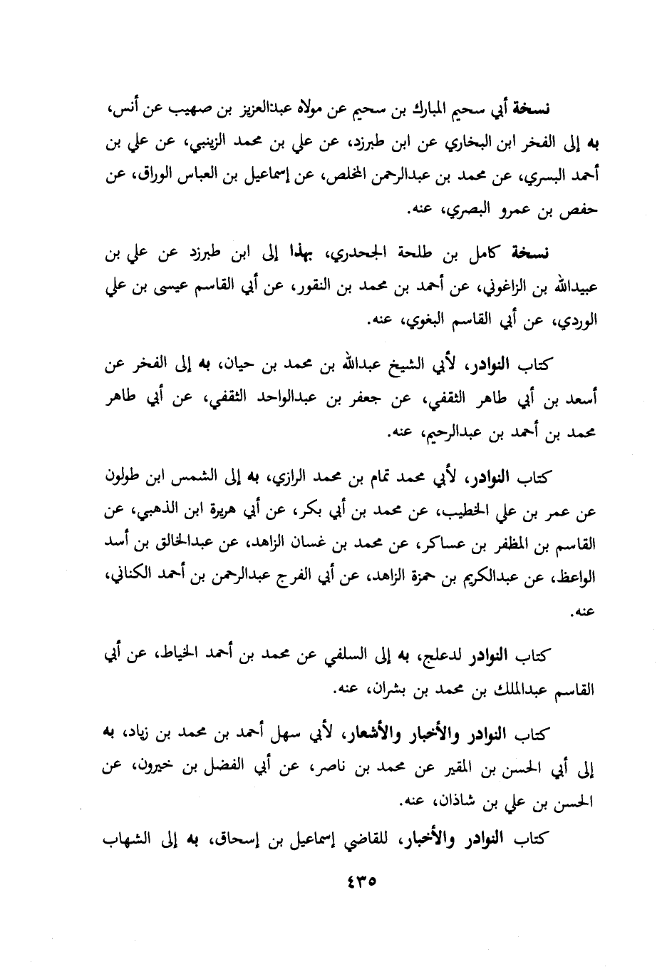 نسخة ابي سحيم المبارك بن سحيم عن مولاه عبد العزيز بن صهيب عن انس به الي الفخر ابن البخاري عن ابن طبرزد عن علي بن محمد الزينبي عن علي بن احمد البسري عن محمد بن عبد الرحمن المخلص عن اسماعيل بن العباس الوراق عن حفص بن عمرو البصري عنه نسخة كامل بن طلحة الجحدري بهذا الي ابن طبرزد عن علي بن عبيد الله بن الزاغوني عن احمد بن محمد بن النقور عن ابي القاسم عيسي بن علي الوردي عن ابي القاسم البغوي عنه كتاب النوادر لأبي الشيخ عبد الله بن محمد بن حيان به الي الفخر عن اسعد بن ابي طاهر الثقفي عن جعفر بن عبد الواحد الثقفي عن ابي طاهر محمد بن احمد بن عبد الرحيم عنه كتاب النوادر لأبي محمد تمام بن محمد بن محمد الرازي به الي الشمس ابن طولون عن عمر بن علي الخطيب عن محمد بن ابي بكر عن ابي هريرة ابن الذهبي عن القاسم بن المظفر بن عساكر عن محمد بن غسان الزاهد عن عبد الخالق بن اسد الواعظ عن عبد الكريم بن حمزة الزاهد عن ابي الفرج عبد الرحمن بن احمد الكناني عنه كتاب النوادر لدعلج به الي السلفي عن محمد بن احمد الخياط عن ابي القاسم عبد الملك بن محمد بن بشران عنه كتاب النوادر والاخبار والاشعار لأبي سهل احمد بن محمد بن زياد به الي ابي الحسن بن المقير عن محمد بن ناصر عن ابي الفضل بن خيرون عن الحسن بن علي بن شاذان عنه كتاب النوادر والاخبار للقاضي اسماعيل بن اسحاق به الي الشهاب