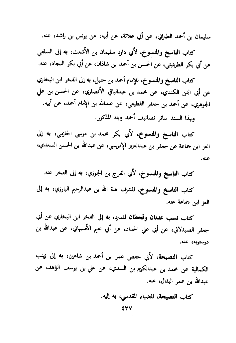 سليمان بن احمد الطبراني عن ابي علاثة عن ابيه عن يونس بن راشد عنه كتاب الناسخ والمنسوخ لأبي داود سليمان بن الاشعث به الي السلفي عن ابي بكر الطريثيثي عن الحسن بن احمد بن شاذان عن ابي بكر النجاد عنه كتاب الناسخ والمنسوخ للإمام احمد بن حنبل به الي الفخر ابن البخاري عن ابي اليمن الكندي عن محمد بن عبد الباقي الانصاري عن الحسن بن علي الجوهري عن احمد بن جعفر القطيعي عن عبد الله بن الامام احمد عن ابيه وبهذا السند سائر تصانيف احمد وابنه المذكور كتاب الناسخ والمنسوخ لأبي بكر محمد بن موسي الحازمي به الي العز ابن جماعة عن جعفر بن عبد العزيز الادريسي عن عبد الله بن الحسن السعدي عنه كتاب الناسخ والمنسوخ لأبي الفرج بن الجوزي به الي الفخر عنه كتاب الناسخ والمنسوخ للشرف هبة الله بن عبد الرحيم البارزي به الي العز ابن جماعة عنه كتاب نسب عدنان وقحطان للمبرد به الي الفخر ابن البخاري عن ابي جعفر الصيدلاني عن ابي علي الحداد عن ابي نعيم الاصبهاني عن عبد الله بن درستويه عنه كتاب النصيحة لأبي حفص عمر بن احمد بن شاهين به الي زينب الكمالية عن محمد بن عبد الكريم بن السدي عن علي بن يوسف الزاهد عن عبد الله بن عمر البقال عنه كتاب النصيحة للضياء المقدسي به اليه