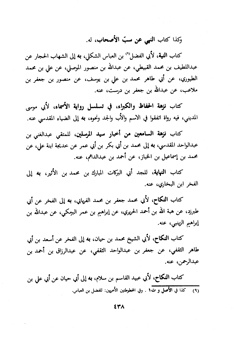 وكذا كتاب النهي عن سب الاصحاب له كتاب النية لأبي الفضل بن العباس الشكلي به الي الشهاب الحجار عن عبد اللطيف بن محمد القبيطي عن عبد الله بن منصور الموصلي عن علي بن محمد الطيوري عن ابي طاهر محمد بن علي بن يوسف عن منصور بن جعفر بن ملاعب عن عبد الله بن جعفر بن درست عنه كتاب نزهة الحفاظ والكبراء في تسلسل رواية الاسماء لأبي موسي المديني فيه رواة اتفقوا في الاسم والاب والجد ونحوه به الي الضياء المقدسي عنه كتاب نزهة السامعين من اخبار سيد المرسلين للمتقي عبد الغني بن عبد الواحد المقدسي به الي محمد بن ابي بكر بن ابي عمر عن خديجة ابنة علي عن محمد بن اسماعيل بن الخباز عن احمد بن عبد الدائم عنه كتاب النهاية للجد ابي البركات المبارك بن محمد بن الاثير به الي الفخر ابن البخاري عنه كتاب النكاح لأبي محمد جعفر بن محمد الفريابي به الي الفخر عن ابي طبرزد عن هبة الله بن احمد الحريري عن ابراهيم بن عمر البرمكي عن عبد الله بن ابراهيم الزينبي عنه كتاب النكاح لأبي الشيخ محمد بن حيان به الي الفخر عن اسعد بن ابي طاهر الثقفي عن جعفر بن عبد الواحد الثقفي عن عبد الرزاق بن احمد بن عبد الرحمن عنه كتاب النكاح لأبي عبيد الله القاسم بن سلام به الي ابي حيان عن ابي علي بن