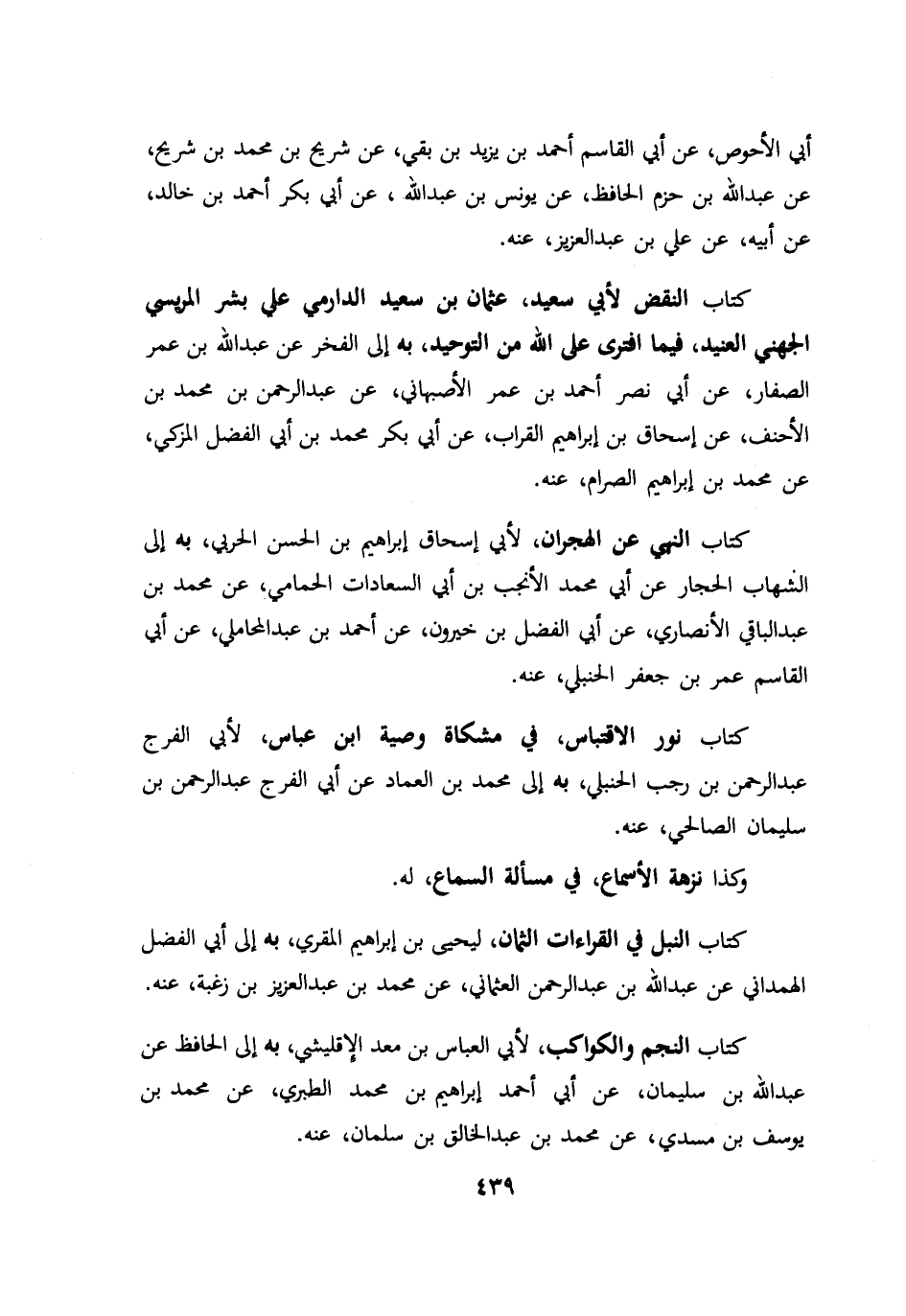 ابي الاحوص عن ابي القاسم احمد بن يزيد بن بقي عن شريح بن محمد بن شريح عن عبد الله بن حزم الحافظ عن يونس بن عبد الله عن ابي بكر احمد بن خالد عن ابيه عن علي بن عبد العزيز عنه كتاب النقض لأبي سعيد عثمان بن سعيد الدارمي علي بشر المريسي الجهني العنيد فيما افتري علي الله من التوحيد به الي الفخر عن عبد الله بن عمر الصفار عن ابي نصر احمد بن عمر الاصبهاني عن عبد الرحمن بن محمد بن الاحنف عن اسحاق بن ابراهيم القراب عن ابي بكر محمد بن ابي الفضل المزكي عن محمد بن ابراهيم الصرام عنه كتاب النهي عن الهجران لأبي اسحاق ابراهيم بن الحسن الحربي به الي الشهاب الحجار عن ابي محمد الانجب بن ابي السعادات الحمامي عن محمد بن عبد الباقي الانصاري عن ابي الفضل بن خيرون عن احمد بن عبد المحاملي عن ابي القاسم عمر بن جعفر الحنبلي عنه كتاب نور الاقتباس في مشكاة وصية ابن عباس لأبي الفرج عبد الرحمن بن رجب الحنبلي به الي محمد بن العماد عن ابي الفرج عبد الرحمن بن سليمان الصالحي عنه وكذا نزهة الاسماع في مسألة السماع له كتاب النيل في القراءات الثمان ليحيي بن ابراهيم المقري به الي ابي الفضل الهمداني عن عبد الله بن عبد الرحمن العثماني عن محمد بن عبد العزيز بن زغبة عنه كتاب النجم والكواكب لأبي العباس بن معد الاقليشي به الي الحافظ عن عبد الله بن سليمان عن ابي احمد ابراهيم بن محمد الطبري عن محمد بن يوسف بن مسدي عن محمد بن عبد الخالق بن سليمان عنه