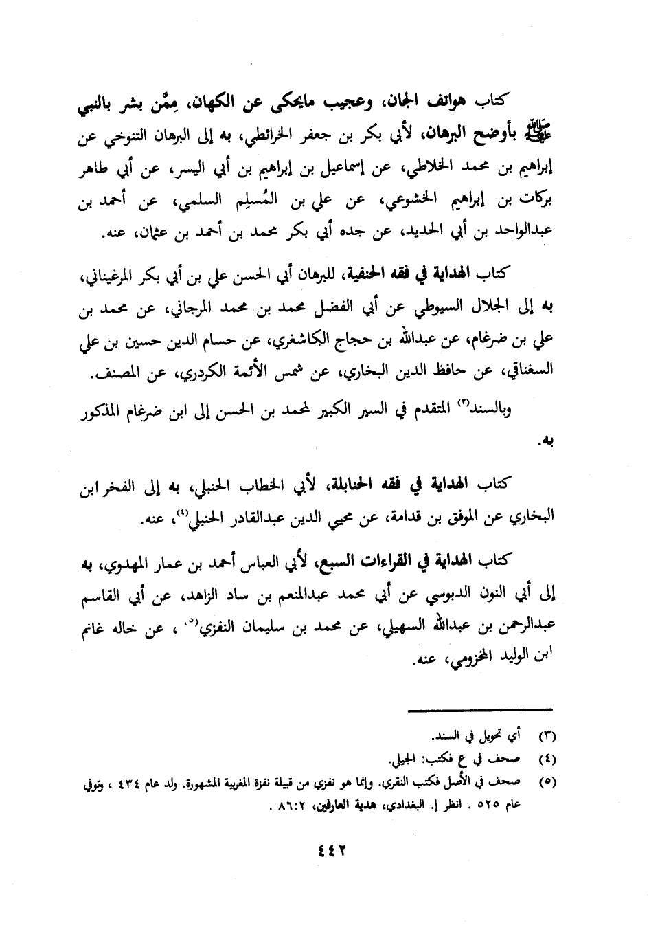 كتاب هواتف الجان وعجيب ما يحكي عن الكهان ممن بشر بالنبي صلي الله عليه وسلم بأوضح البرهان لأبي بكر بن جعفر الخرائطي به الي البرهان التنوخي عن ابراهيم بن محمد الخلاطي عن اسماعيل بن ابراهيم بن ابي اليسر عن ابي طاهر بركات بن ابراهيم الخشوعي عن علي بن المسلم السلمي عن احمد بن عبد الواحد بن ابي الحديد عن جده ابي بكر محمد بن احمد بن عثمان عنه كتاب الهداية في فقه الحنيفة للبرهان ابي الحسن علي بن ابي بكر المرغيناني به الي الجلال السيوطي عن ابي الفضل محمد بن محمد المرجاني عن محمد بن علي بن ضرغام عن عبد الله بن حجاج الكاشغري عن حسام الدين حسين بن علي السغناقي عن حافظ الدين البخاري عن شمس الائمة الكردري عن المصنف وبالسند المتقدم في السير الكبير لمحمد بن الحسن الي ابن ضرغام المذكور به كتاب الهداية في فقه الحنابلة لأبي الخطاب الحنبلي به الي الفخر ابن البخاري عن الموفق بن قدامة عن محيي الدين عبد القادر الحنبلي عنه كتاب الهداية في القراءات السبع لأبي العباس احمد بن عمار المهدوي به الي ابي النون الدبوسي عن ابي محمد عبد المنعم بن ساد الزاهد عن ابي القاسم عبد الرحمن بن عبد الله السهيلي عن محمد بن سليمان النفزي عن خاله غانم ابن الوليد المخزومي عنه