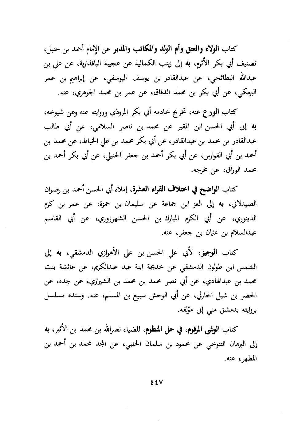 كتاب الولاء والعتق وام الولد والمكاتب والمدبر عن الامام احمد بن حنبل تصنيف ابي بكر الاثرم به الي زينب الكمالية عن عجيبة الباقذارية عن علي بن عبد الله البطائحي عن عبد القادر بن يوسف اليوسفي عن ابراهيم بن عمر البرمكي عن ابي بكر بن محمد الدقاق عن عمر بن محمد الجوهري عنه كتاب الورع عنه تخريج خادمه ابي بكر المروذي وروايته عنه وعن شيوخه به الي ابي الحسن ابن المقير عن محمد بن ناصر السلامي عن ابي طالب عبد القادر بن محمد بن عبد القادر عن ابي بكر محمد بن علي الخياط عن محمد بن احمد بن ابي الفوارس عن ابي بكر احمد بن جعفر الحنبلي عن ابي بكر احمد بن محمد الوراق عن مخرجه كتاب الواضح في اختلاف القراء العشرة املاء ابي الحسن احمد بن رضوان الصيدلاني به الي العز ابن جماعة عن سليمان بن حمزة عن عمر بن كرم الدينوري عن ابي الكرم بن الحسن الشهرزوري عن ابي القاسم عبد السلام بن عثمان بن جعفر عنه كتاب الوجيز لأبي علي الحسن بن علي الاهوازي الدمشقي به الي الشمس ابن طولون الدمشقي عن خديجة ابنة عبد الكريم عن عائشة بنت محمد بن عبد الهادي عن ابي نصر محمد بن محمد بن الشيرازي عن جده عن الخضر بن شبل الحارثي عن ابي الوحش سبيع بن المسلم وسنده مسلسل بروايته بدمشق مني الي مؤلفه كتاب الوشي المرقوم في حل المنظوم للضياء نصر الله بن محمد بن الاثير به الي الي البرهان التنوخي عن محمود بن سلمان الحلبي عن المجد محمد بن احمد بن المطهر عنه