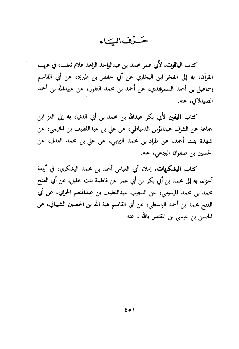 كتاب الياقوت لأبي عمر محمد بن عبد الواحد الزاهد غلام ثعلب في غريب القرآن به الي الفخر ابن البخاري عن ابي حفص بن طبرزد عن ابي القاسم اسماعيل بن احمد السمرقندي عن احمد بن محمد النقور عن عبيد الله بن احمد الصيدلاني عنه كتاب اليقين لأبي بكر عبد الله بن محمد بن ابي الدنيا به الي العز ابن جماعة عن الشرف عبد المؤمن الدمياطي عن علي بن عبد اللطيف بن الخيمي عن شهدة بنت احمد عن طراد بن محمد الزينبي عن علي بن محمد العدل عن الحسين بن صفوان البردعي عنه كتاب اليشكريات املاء ابي العباس احمد بن محمد اليشكري في اربعة اجزاء به الي محمد بن ابي بكر بن ابي عمر عن فاطمة بنت خليل عن ابي الفتح محمد بن محمد الميدومي عن النجيب عبد اللطيف بن عبد المنعم الحراني عن ابي الفتح محمد بن احمد الواسطي عن ابي القاسم هبة الله بن الحصين الشيباني عن الحسن بن عيسي بن المقتدر بالله عنه