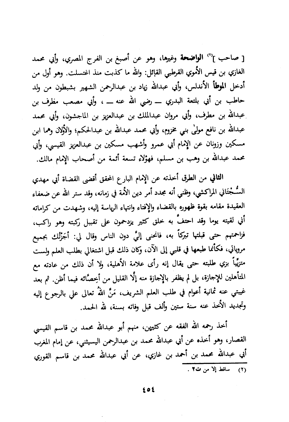 صاحب الواضحة وغيرها وهو عن اصبغ بن الفرج المصري وابي محمد الغازي بن قيس الاموي القرطبي القائل والله ما كذبت منذ اغتسلت وهو اول من ادخل الموطأ الاندلس وابي عبد الله زياد بن عبد الرحمن الشهير بشبطون من ولد حاطب بن ابي بلتعة البدري رضي الله عنه وابي مصعب مظرف بن عبد الله بن مطرف وابي مروان عبد الملك بن عبد العزيز بن الماجشون وابي محمد عبد الله بن نافع مولي بني مخزوم وابي محمد عبد الله بن عبد الحكم والاولان وهما ابن مسكين وزونان عن الامام ابي عمرو واشهب مسكين بن عبد العزيز القيسي وابي محمد عبد الله بن وهب بن مسلم فهؤلاء تسعة ائمة من اصحاب الامام مالك الثاني من الطرق اخذته عن الامام البارع المحقق اقضي القضاة ابي مهدي السجتاني المراكشي وظني انه مجدد امر دين الامة في زمانه وقد ستر الله عن ضعفاء العقيدة مقامه ظهوره بالقضاء والافتاء وانتهاء الرياسة اليه وشهدت من كراماته اني لقيته يوما وقد احتف به خلق كثير يزدحمون علي تقبيل ركبته وهو راكب فزاحمتهم حتي قبلتها تبركا به فانحني الي دون الناس وقال لي اجزتك بجميع مروياتي فكأنما طبعها في قلبي الي الان زكان ذلك قبل اشتغالي بطلب العلم ولست متزييا بزي طلبته حتي يقال انه رأي علامة الأهلية ولا ان ذلك من عادته مع المتأهلين للإجازة بل لم يظفر بالإجازة منه الا القليل من اخصائه فيما اظن ثم بعد غيبتي عنه ثمانية اعوام في طلب العلم الشريف من الله تعالي علي بالرجوع اليه وتجديد الاخذ عنه سنة ستين والف قبل وفاته بسنة لله الحمد اخذ رحمه الله الفقه عن كثيرين منهم ابو عبد الله محمد بن قاسم القيسي القصار وهو اخذه عن ابي عبد الله محمد بن عبد الرحمن اليسيثني عن امام المغرب ابي عبد الله محمد بن احمد بن غازي عن ابي عبد الله محمد بن قاسم القوري