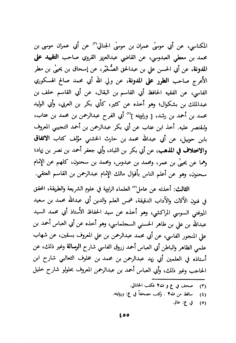 المكناسي عن ابي موسي عمران بن موسي الجناتي عن ابي عمران موسي بن محمد بن معطي العبدوسي عن القاضي عبد العزيز القروي صاحب التقييد علي المدونة عن ابي الحسن علي بن عبد الحق الصغير عن اسحاق بن يحيي بن مطر الاعرج صاحب الطرر علي المدونة عن ولي الله ابي محمد صالح الهسكوري الفاسي عن الفقيه الحافظ ابي القاسم بن البقال عن ابي القاسم خلف بن عبد الملك بن بشكوال وهو اخذه عن كثير كأبي بكر بن العربي وابي الوليد محمد بن احمد بن رشد روايته ابي الفرح عبد الرحمن بن محمد بن عتاب ولنقتصر عليه اخذ ابن عتاب عن ابي بكر عبد الرحمن بن احمد التجيبي المعروف بابن حوبيل عن ابي عبد الله محمد بن حارث الخشني مؤلف كتاب الاتفاق والاختلاف في المذهب عن ابي بكر بن اللباد وابي جعفر احمد بن نصر بن زياد وهما عن يحيي بن عمر ومحمد بن عبدوس ومحمد بن سحنون كلهم عن الامام سحنون وهو عن اعلم الناس بأقوال مالك الامام عبد الرحمن بن القاسم العتقي الثالث اخذته عن عامل العلماء الرواية في علوم الشريعة والطريقة المحقق في فنون الالات والاداب الدقيقة شمس العلم والدين ابي عبد الله محمد بن سعيد الميرغتي السوسي المراكشي وهو اخذخ عن سيد الحفاظ الاستاذ ابي محمد السيد عبد الله بن علي بن طاهر الحسني السلجماسي وهو اخذه عن ابي العباس احمد بن علي المنجور الفاسي عن ابي محمد عبد الرحمن بن علي المعروف بسقين عن شهاب علمي الظاهر والباطن ابي العباس احمد زورق الفاسي شارح الرسالة وغير ذلك عن استاذه في العلمين ابي زيد عبد الرحمن بن محمد بن مخلوف الثعالبي شارح ابن الحاجب وغير ذلك وابي العباس احمد بن عبد الرحمن المعروف بحلولو شارح خليل