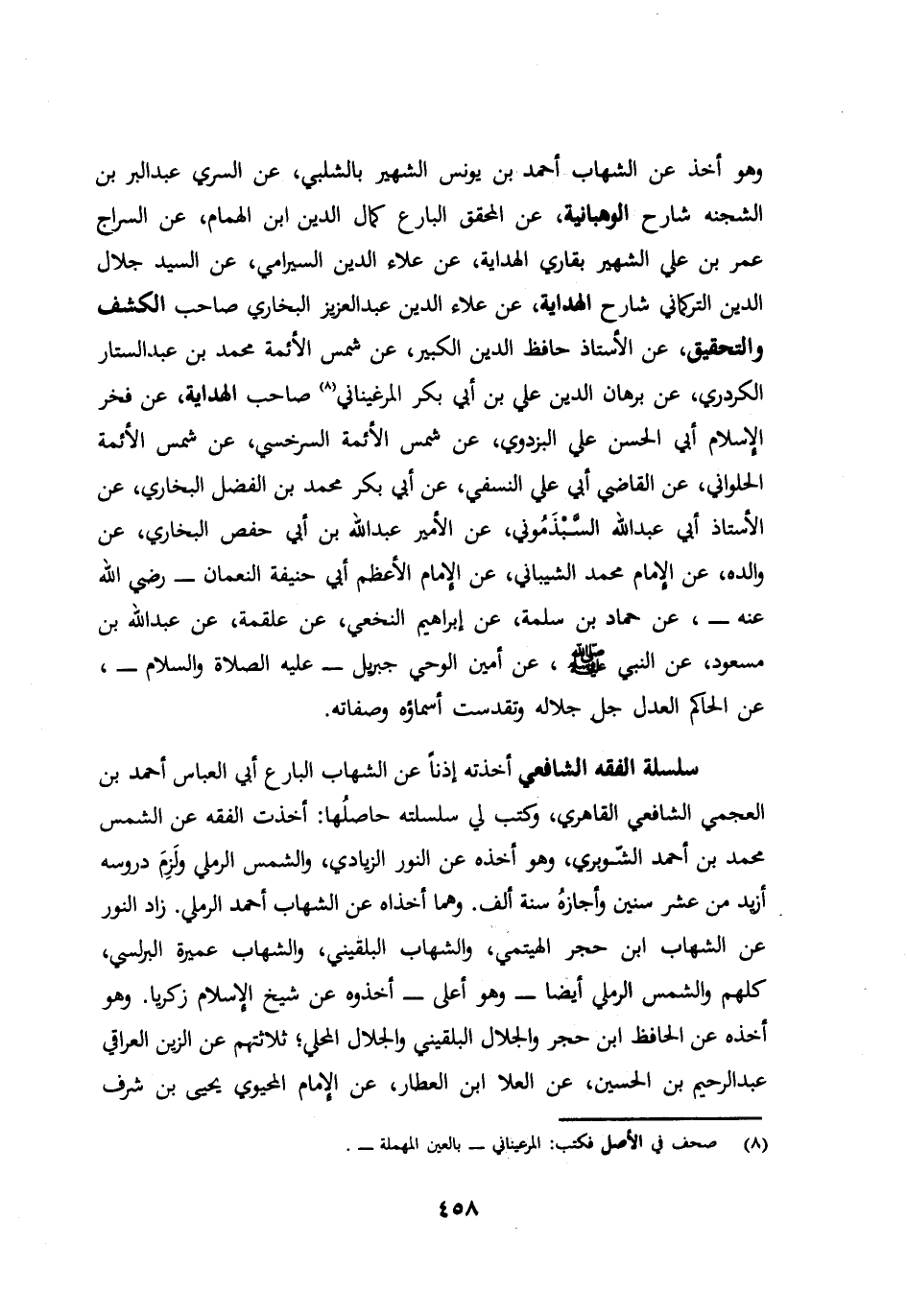 وهو اخذ عن الشهاب احمد بن يونس الشهير بالشلبي عن السري عبد البر بن الشجنة شارح الوهبانية عن المحقق البارع كمال الدين ابن الهمام عن السراج عمر بن علي الشهير بقاري الهداية عن علاء السيرامي عن السيد جلال الدين التركامني شارح الهداية عن علاء الدين عبد العزيز البخاري صاحب الكشف والتحقيق عن الاستاذ حافظ الدين الكبير عن شمس الائمة محمد بن عبد الستار الكردري عن برهان الدين علي بن ابي بكر المرغيناني صاحب الهداية عن فخر الاسلام ابي الحسن علي البزدوي عن شمس الائمة السرخسي عن شمس الائمة الحلواني عن القاضي ابي علي النسفي عن ابي بكر محمد بن الفضل البخاري عن الاستاذ ابي عبد الله السبذموني عن الامير عبد الله بن ابي حفص البخاري عن والده عن الامام محمد الشيباني عن الامام الاعظم ابي حنيفة النعمان رضي الله عنه عن حماد بن سلمة عن ابراهيم النخعي عن علقمة عن عبد الله بن مسعود عن النبي صلي الله عليه وسلم عن امين الوحي جبريل عليه الصلاة والسلام عن الحاكم العدل جل جلاله وتقدست اسماؤه وصفاته سلسلة الفقه الشافعي اخذته اذنا عن الشهاب البارع ابي العباس احمد بن العجمي الشافعي القاهري وكتب لي سلسلته حاصلها اخذت الفقه عن الشمس محمد بن احمد الشوبري وهو اخذه عن النور الزيادي والشمس الرملي ولزم دروسه ازيد من عشر سنين واجازة سنة الف وهما اخذاه عن الشهاب احمد الرملي زاد النور عن الشهاب ابن حجر الهيتمي والشهاب البلقيني والشهاب عميرة البرلسي كلهم والشمس الرملي ايضا وهو اعلي اخذوه عن شيخ الاسلام زكريا وهو اخذه عن الحافظ ابن حجر والجلال البلقيني والجلال المحلي ثلاثتهم عن الزين العراقي عبد الرحيم بن الحسين عن العلا ابن العطار عن الامام المحيوي يحيي بن شرف