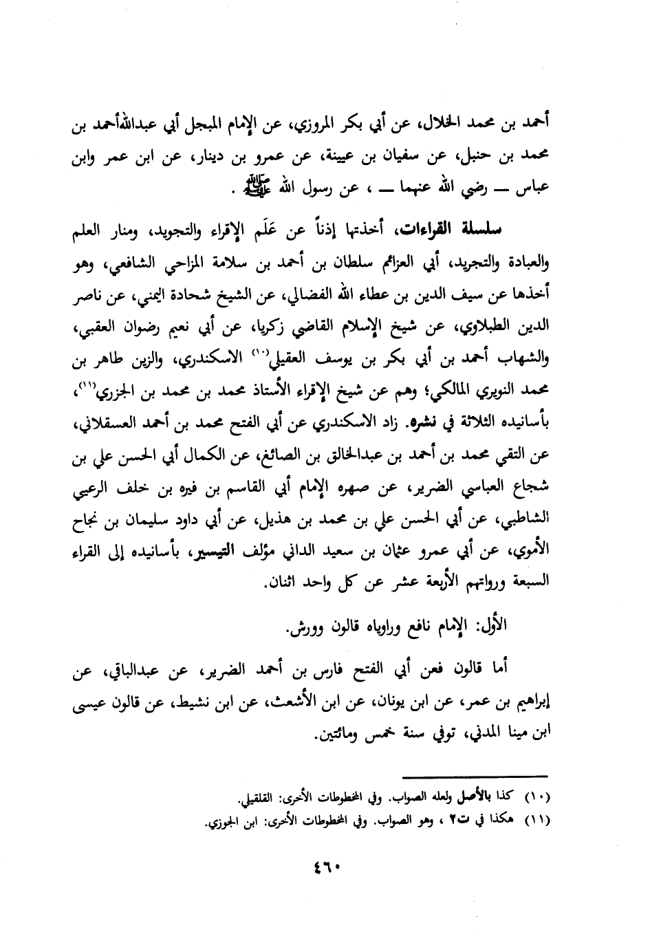 احمد بن محمد الخلال عن ابي بكر المروزي عن الامام المبجل ابي عبد الله احمد بن محمد بن حنبل عن سفيان بن عيينة عن عمرو بن دينار عن ابن عمر وابن عباس رضي الله عنهما عن رسول الله صلي الله عليه وسلم سلسلة القراءات اخذتها اذنا عن علم الاقراء والتجويد ومنار العلم والعبادة والتجريد ابي العزائم سلطان بن احمد بن سلامة المزاحي الشافعي وهو اخذها عن سيف الدين بن عطاء الله الفضالي عن الشيخ شحادة اليمني عن ناصر الدين الطبلاوي عن شيخ الاسلام القاضي زكريا عن ابي نعيم رضوان العقبي والشهاب احمد بن ابي بكر بن يوسف العقيلي الاسكندري والزين طاهر بن محمد النويري المالكي وهم عن شيخ الاقراء الاستاذ محمد بن محمد الجزري بأسانيده الثلاثة في نشره زاد الاسكندري عن ابي الفتح محمد بن احمد العسقلاني عن التقي محمد بن احمد بن عبد الخالق بن الصائغ عن الكمال ابي الحسن علي بن شجاع العباسي الضرير عن صهره الامام ابي القاسم بن فيره بن خلف الرعيي الشاطبي عن ابي الحسن علي بن محمد بن هذيل عن ابي داود سليمان بن نجاح الاموي عن ابي عمرو عثمان بن سعيد الداني مؤلف التيسير بأسانيده الي القراء السبعة ورواتهم الاربعة عشر عن كل واحد اثنان الاول الامام نافع ورواياه قالون وورش اما قالون فعن ابي الفتح فارس بن احمد الضرير عن عبد الباقي عن ابراهيم بن عمر عن ابن يونان عن ابن الاشعث عن ابن نشيط عن قالون عيسي ابن مينا المدني توفي سنة خمس ومائتين