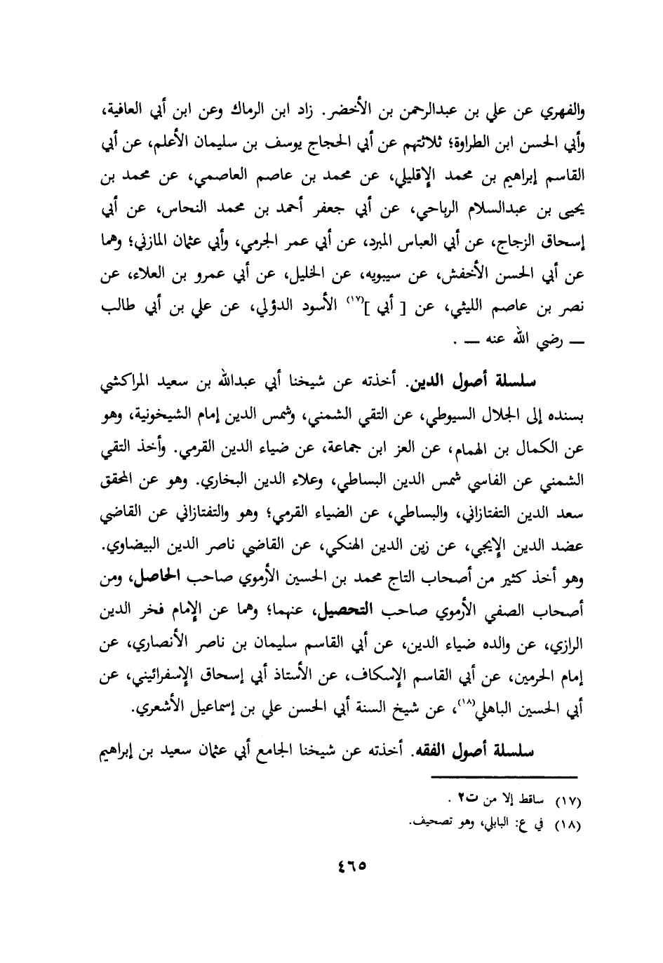 والفهري عن علي بن عبد الرحمن بن الاخضر زاد ابن الرماك وعن ابن ابي العافية وابي الحسن ابن الطراوة ثلاثتهم عن ابي الحجاج يوسف بن سليمان الاعلم عن ابي القاسم ابراهيم بن محمد الاقليلي عن محمد بن عاصم العاصمي عن محمد بن يحيي بن عبد السلام الرباحي عن ابي جعفر احمد بن محمد النحاس عن ابي اسحاق الزجاج عن ابي العباس المبرد عن ابي عمر الجرمي وابي عثمان المازني وهما عن ابي الحسن الاخفش عن سيبويه عن الخليل عن ابي عمرو بن العلاء عن نصر بن عاصم الليثي عن ابي الاسود الدؤلي عن علي بن ابي طالب رضي الله عنه سلسلة اصول الدين اخذته عن شيخنا ابي عبد الله بن سعيد المراكشي بسنده الي الجلال السيوطي عن التقي الشمني وشمس الدين امام الشيخونية وهو عن الكمال بن الهمام عن العز ابن جماعة عن ضياء الدين القرمي واخذ التقي الشمني عن الفاسي شمس الدين البساطي وعلاء الدين البخاري وهو عن المحقق سعد الدين التفتازاني والبساطي عن الضياء القرمي وهو والتفتازاني عن القاضي عضد الدين الايجبي عن زين الدين الهنكي عن القاضي ناصر الدين البيضاوي وهو اخذ كثير من اصحاب التاج محمد بن الحسين الارموي صاحب الحاصل ومن اصحاب الصفي الارموي صاحب التحصيل عنهما وهما عن الامام فخر الدين الرازي عن والده ضياء الدين عن ابي القاسم سليمان بن ناصر الانصاري عن امام الحرمين عن ابي القاسم الاسكاف عن الاستاذ ابي اسحاق الاسفرائيني عن ابي الحسين الباهلي عن شيخ السنة ابي الحسن علي بن اسماعيل الاشعري سلسلة اصول الفقه اخذته عن شيخنا الجامع ابي عثمان سعيد بن ابراهيم