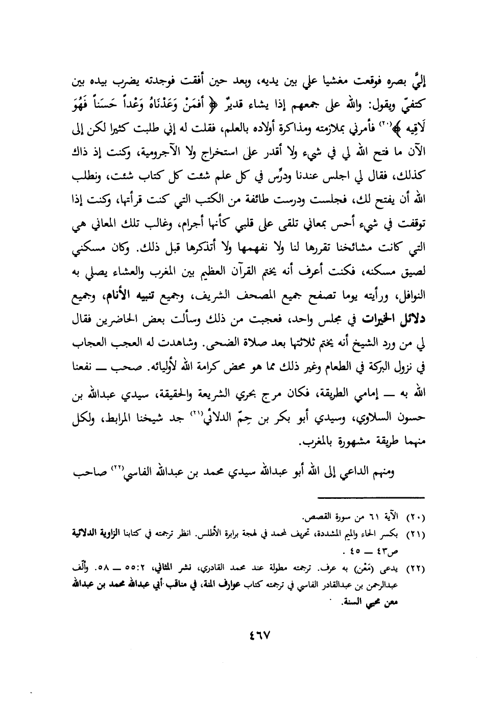 الي بصره فوقعت مغشيا علي بين يديه وبعد حين افقت فوجدته يضرب بيده بين كتفي ويقول والله علي جمعهم اذا يشاء قدير: أفمن وعدناه وعدا حسنا فهو لاقيه. فأمرني بملازمته ومذاكرة اولاده بالعلم فقلت له اني طلبت كثيرا لكن الي الان ما فتح الله لي في شئ ولا اقدر علي استخراج ولا الآجرومية وكنت اذ ذاك كذلك فقال لي اجلس عندنا ودرس في كل علم شئت كل كتاب شئت ونطلب الله ان يفتح لك فجلست ودرست طائفة من الكتب التي كنت قرأتها وكنت اذا توقفت في شئ احس بمعاني تلقي علي قلبي كأنها اجرام وغالب تلك المعاني هي التي كانت مشائخنا تقررها لنا ولا نفهمها ولا اتذكرها قبل ذلك وكان مسكني لصيق مسكنه فكنت اعرف انه يختم القرآن العظيم بين المغرب والعشاء يصلي به النوافي ورأيته يوما تصفح جميع المصحف الشريف وجميع تنبيه الانام وجميع دلائل الخيرات في مجلس واحد فعجبت من ذلك وسألت بعض الحاضرين فقال لي من ورد الشيخ انه يختم ثلاثتها بعد صلاة الضحي وشاهدت له العجب العجاب في نزول البركة في الطعام وغير ذلك مما هو محض كرامة الله لأوليائه صحب نفعنا الله به امامي الطريقة فكان مرج بحري الشريعة والحقيقة سيدي عبد الله بن حسون السلاوي وسيدي ابو بكر بن حم الدلائي جد شيخنا المرابط ولكل منهما طريقة مشهورة بالمغرب ومنهم الداعي الي الله ابو عبد الله سيدي محمد بن عبد الله الفاسي صاحب