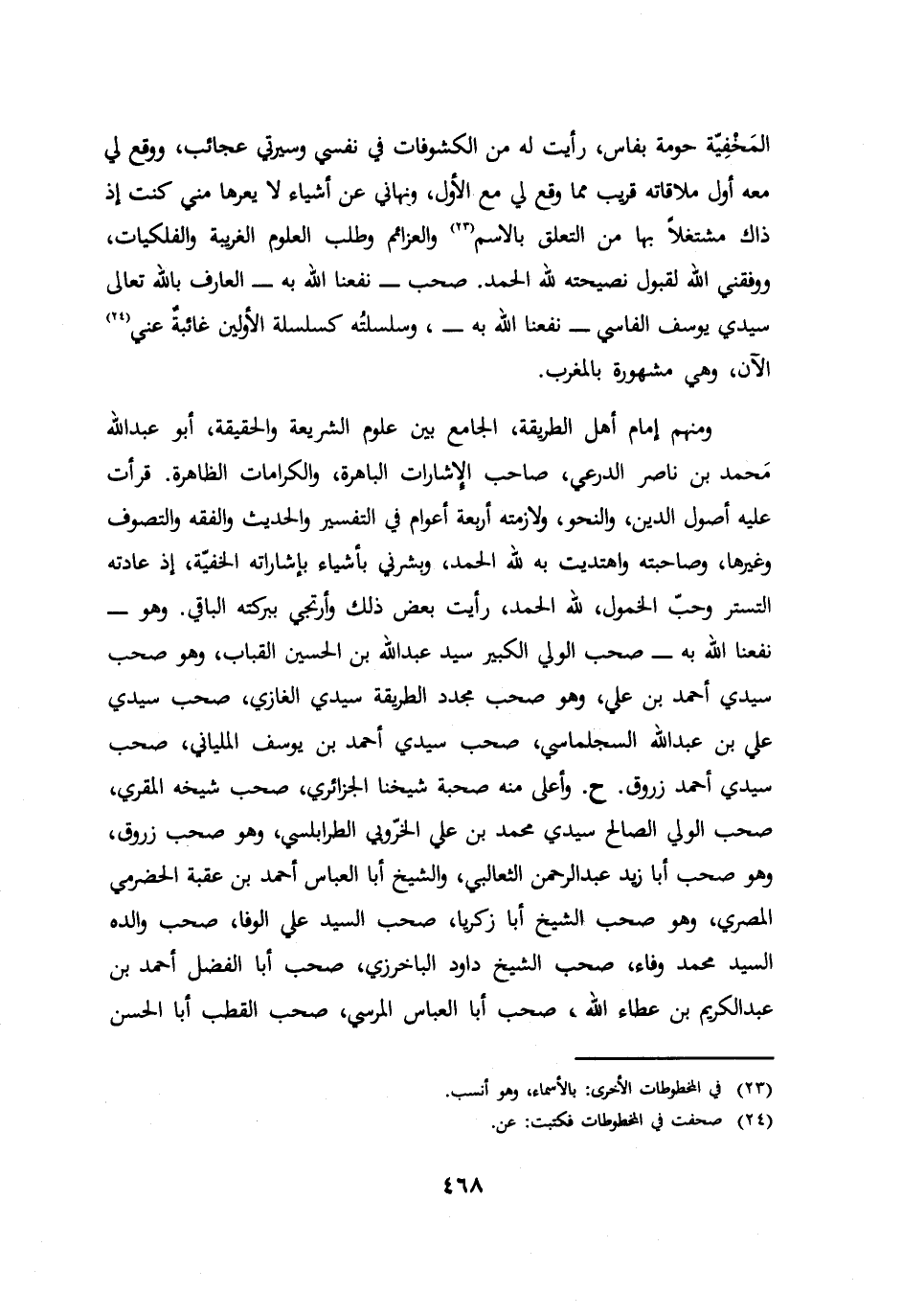 المخفية حومة بفاس رأيت له من الكشوفات في نفسي وسيرتي عجائب ووقع لي معه اول مالاقاته قريب مما وقع لي مع الاول ونهاني عن اشياء لا يعرها مني كنت اذ ذاك مشتغلا بها من التعلق بالاسم والعزائم وطلب العلوم الغريبة والفلكيات ووفقني الله لقبول نصيحته لله الحمد صحب نفعنا الله به العارف بالله تعالي سيدي يوسف الفاسي نفعنا الله به وسلسلته كسلسلة الاولين غائبة عني الان وهي مشهورة بالمغرب ومنهم اما اهل الطريقة الجامع بين علوم الشريعة والحقيقة ابو عبد الله محمد بن ناصر الدرعي صاحب الاشارات الباهرة والكرامات الظاهرة قرأت عليه اصول الدين والنحو ولازمته اربعة اعوام في التفسير والحديث والفقه والتصوف وغيرها وصاحبته واهتديت به لله الحمد وبشرني بأشياء بإشارته الخفيه اذ عادته التستر وحب الخمول لله الحمد رأيت بعض ذلك وارتجي ببركته الباقي وهو نفعنا الله به صحب الولي الكبير سيد عبد الله بن الحسين القباب وهو صحب سيدي احمد بن علي وهو صحب مجدد الطريقة سيدي الغازي صحب سيدي علي بن عبد الله السلجماسي صحب سيدي احمد بن يوسف الملياني صحب سيدي احمد زورق ح واعلي منه صحبة شيخنا الجزائري صحب شيخه المقري صحب الولي الصالح سيدي محمد بن علي الخروبي الطرابلسي وهو صحب زورق وهو صحب ابا زيد عبد الرحمن الثعالبي والشيخ ابا العباس احمد بن عقبة الحضرمي المصري وهو صحب الشيخ ابا زكريا صحب السيد علي الوفا صحب والده السيد محمد وفاء صحب الشيخ داود الباخرزي صحب ابا الفضل احمد بن عبد الكريم بن عطاء الله صحب ابا العباس المرسي صحب القطب ابا الحسن