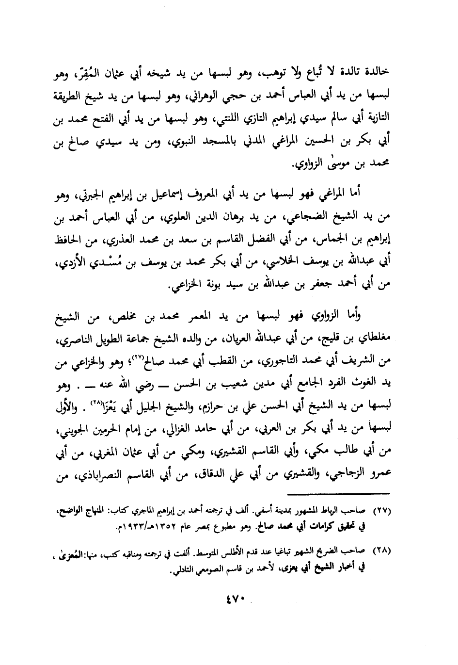 خالدة تالدة لا تباع ولا توهب وهو لبسها من يد شيخه ابي عثمان المقر وهو لبسها من يد ابي العباس احمد بن حجي الوهراني وهو لبسها من يد شيخ الطريقة التازية ابي سالم سيدي ابراهيم التازي اللنتي وهو لبسها من يد ابي الفتح محمد بن ابي بكر بن الحسين المراغي المدني بالمسجد النبوي ومن يد سيدي صالح بن محمد بن موسي الزواوي اما المراغي فهو لبسها من يد ابي المعروف اسماعيل بن ابراهيم الجبرتي وهو من يد بن الشيخ الضجاعي من يد برهان الدين العلوي من ابي العباس احمد بن ابراهيم بن الجماس من ابي الفضل القاسم بن سعد بن محمد العذري من الحافظ ابي عبد الله بن يوسف الخلاسي من ابي بكر محمد بن يوسف بن مسدي الازدي من ابي احمد جعفر بن عبد الله بن سيد بونة الخزاعي واما الزواوي فهو لبسها من يد المعمر محمد بن مخلص من الشيخ مغلطاي بن قليج من ابي عبد الله العريان من والده الشيخ جماعة الطويل الناصري من الشريف ابي محمد التاجوري من القطب ابي محمد صالح وهو والخزاعي من يد الغوث الفرد الجامع ابي مدين شعيب بن الحسن رضي الله عنه وهو لبسها من يد الشيخ ابي الحسن علي بن حرازم والشيخ الجليل ابي يعزا والاول لبسها من يد ابي بكر بن العربي من ابي حامد الغزالي من امام الحرمين الجويني من ابي طالب مكي وابي القاسم القشيري ومكي من ابي عثمان المغربي من ابي عمرو الزجاجي والقشيري من ابي علي الدقاق من ابي القاسم النصراباذي من
