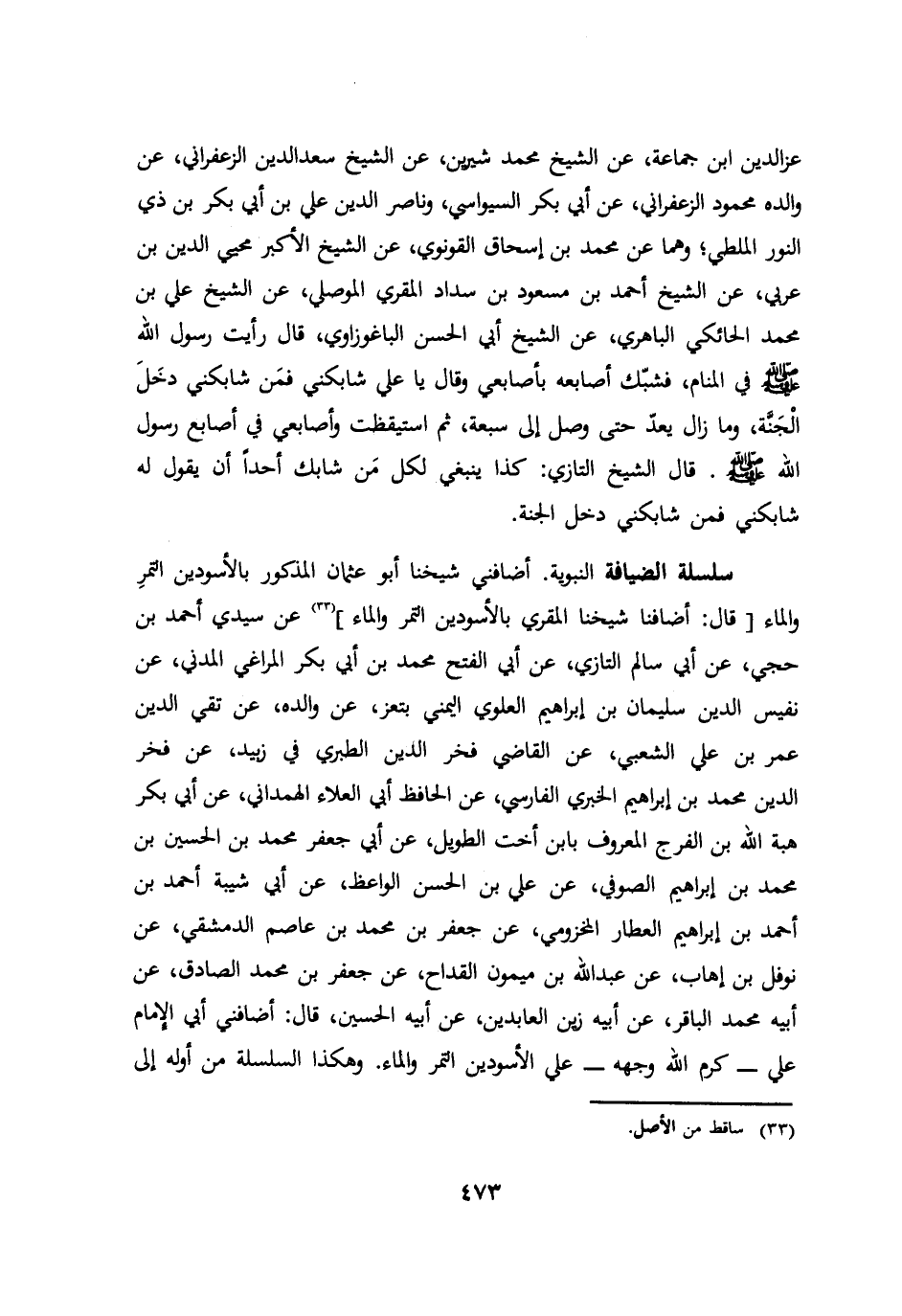 عز الدين ابن جماعة عن الشيخ محمد شيرين عن الشيخ سعد الدين الزعفراني عن والده محمود الزعفراني عن ابي بكر السيواسي وناصر الدين علي بن ابي بكر بن ذي النور الملطي وهما عن محمد بن اسحاق القونوي عن الشيخ الاكبر محيي الدين بن عربي عن الشيخ احمد بن مسعود بن سداد المقري الموصلي عن الشيخ علي بن محمد الحائكي الباهري عن الشيخ ابي الحسن الباغوزاوي قال رأيت رسول الله صلي الله عليه وسلم في المنام فشبك اصابعه بأصابعي وقال يا علي شابكني فمن شابكني دخل الجنة وما زال يعد حتي وصل الي سبعة ثم استيقظ واصابعي في اصابع رسول الله صلي الله عليه وسلم قال الشيخ التازي كذا ينبغي لكل من شابك احدا ان يقول له شابكني فمن شابكني دخل الجنة سلسلة الضيافة النبوية اضافني شيخنا ابو عثمان المذكور بالأسودين التمر والماء قال اضافنا شيخنا المقري بالأسودين التمر والماء عن سيدي احمد بن حجي عن ابي سالم التازي عن ابي الفتح محمد بن ابي بكر المراغي المدني عن نفيس الدين سليمان بن ابراهيم العلوي اليمني بتعز عن والده عن تقي الدين عمر بن علي الشعبي عن القاضي فخر الدين الطبري في زبيد عن فخر الدين محمد بن ابراهيم الخبري الفارسي عن الحافظ ابي العلاء الهمداني عن ابي بكر هبة الله بن الفرج المعروف بابن اخت الطويل عن ابي جعفر محمد بن الحسين بن محمد بن ابراهيم الصوفي عن علي بن الحسن الواعظ عن ابي شيبة احمد بن احمد بن ابراهيم العطار المخزومي عن جعفر بن محمد بن عاصم الدمشقي عن نوفل بن اهاب عن عبد الله بن ميمون القداح عن جعفر بن محمد الصادق عن ابيه محمد الباقر عن ابيه زين العابدين عن ابيه الحسين قال اضافني ابي الامام علي كرم الله وجهه علي الاسودين التمر والماء وهكذا السلسلة من اوله الي
