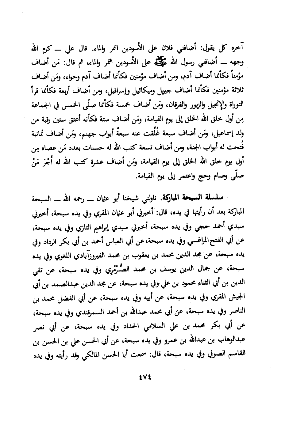 اخره كل يقول اضافني فلان علي الاسودين التمر والماء قال علي كرم الله وجه اضافني رسول الله صلي الله عليه وسلم علي الاسودين التمر والماء وثم قال من اضاف مؤمنا فكأنما اضاف ادم ومن اضاف مؤمنين فكأنما اضاف ادم وحواء ومن اضاف ثلاثة مؤمنين فكأنما اضاف جبريل وميكائيل واسرافيل ومن اضاف اربعة فكأنما قرأ التوراة والانجيل والزبور والفرقان ومن اضاف خمسة فكأنما صلي الخمس في الجماعة من اول خلق الله الخلق الي يوم القيامة ومن اضاف ستة فكأنه اعتق ستين رقبة من ولد اسماعيل ومن اضاف سبعة غلقت عنه سبعة ابواب جهنم ومن اضاف ثمانية فتحت له ابواب الجنة ومن اضاف تسعة كتب الله له حسنات بعدد من عصاه من اول يوم خلق الله الخلق الي يوم القيامة ومن اضاف عشرة كتب الله له اجر من صلي وصام وحج واعتمر الي يوم القيامة سلسلة السبحة المباركة ناولني شيخنا ابو عثمان رحمه الله السبحة المباركة بعد ان رأيتها في يده قال اخبرني ابو عثمان المقري وفي يده سبحة اخبرني سيدي احمد حجي وفي يده سبحة اخبرني سيدي ابراهيم التازي وفي يده سبحة عن ابي الفتح المراغسي وفي يده سبحة عن ابي العباس احمد بن ابي بكر الرداد وفي يده سبحة عن مجد الدين محمد بن يعقوب بن محمد الفيروزابادي اللغوي وفي يده سبحة عن جمال الدين يوسف بن محمد الصرمري وفي يده سبحة عن تقي الدين بن ابي الثناء محمود بن علي وفي يده سبحة عن مجد الدين عبد الصمد بن ابي الجيش المقري وفي يده سبحة عن ابيه وفي يده سبحة عن ابي الفضل محمد بن الناصر وفي يده سبحة عن ابي محمد عبد الله بن احمد السمرقندي وفي يده سبحة عن ابي بكر محمد بن علي السلامي الحداد وفي يده سبحة عن ابي نصر عبد الوهاب بن عبد الله بن عمرو وفي يده سبحة عن ابي الحسن علي بن الحسن بن القاسم الصوفي وفي يده سبحة قال سمعت ابا الحسن المالكي وقد رلأيته وفي يده