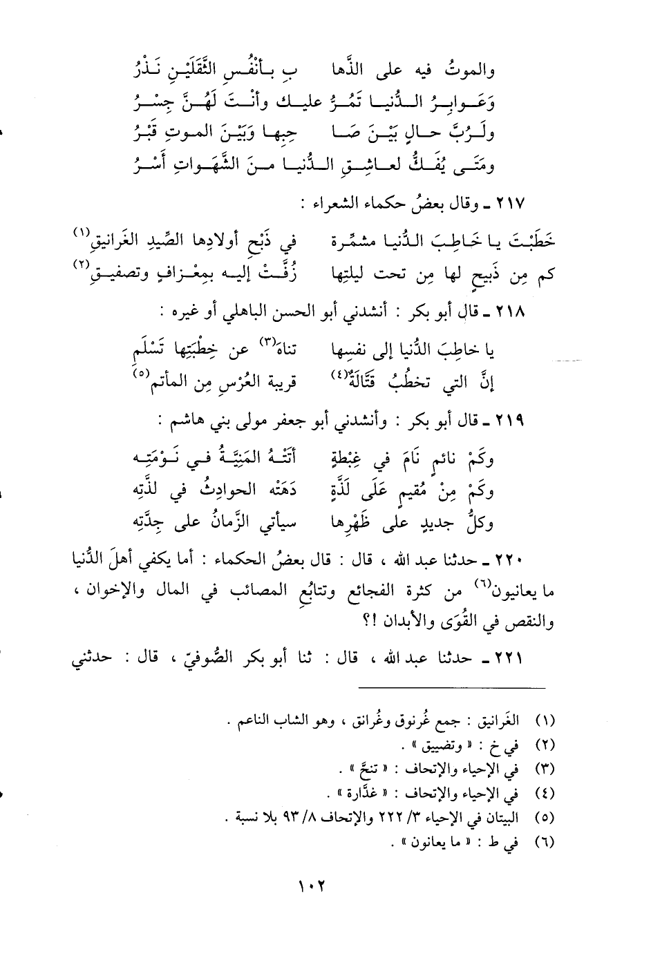 207 - حَدَّثَنَا عَبْدُ اللَّهِ، قَالَ: قَالَ بَعْضُ الْحُكَمَاءِ: أَمَا §يَكْفِي أَهْلَ الدُّنْيَا مَا يُعَايِنُونَ مِنْ كَثْرَةِ الْفَجَائِعِ وَتَتَابُعِ الْمَصَائِبِ فِي الْمَالِ وَالْإِخْوَانِ، وَالنَّقْصِ فِي الْقُوَى وَالْأَبْدَانِ؟