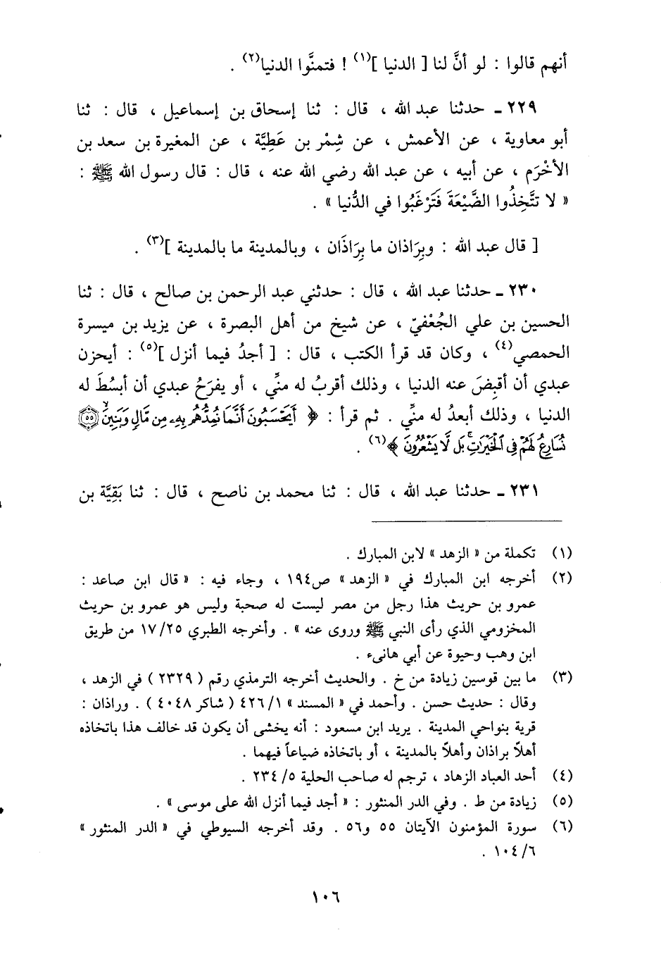 215 - حَدَّثَنَا عَبْدُ اللَّهِ، قَالَ: ثَنَا إِسْحَاقُ بْنُ إِسْمَاعِيلَ، قَالَ: ثَنَا أَبُو مُعَاوِيَةَ، عَنِ الْأَعْمَشِ، عَنِ شِمْرِ بْنِ عَطِيَّةَ، عَنِ الْمُغِيرَةِ بْنِ سَعْدِ بْنِ الْأَخْرَمِ، عَنِ أَبِيهِ، عَنْ عَبْدِ اللَّهِ، رَضِيَ اللَّهُ عَنْهُ، قُلْ: قَالَ رَسُولُ صَلَّى اللَّهُ عَلَيْهِ وَسَلَّمَ: «§لَا تَتَّخِذُوا الضَّيْعَةَ فَتَرْغَبُوا فِي الدُّنْيَا» . قَالَ عَبْدُ اللَّهِ: وَبِرَاذَانَ مَا بِرَاذَانَ وَبِالْمَدِينَةِ مَا بِالْمَدِينَةِ