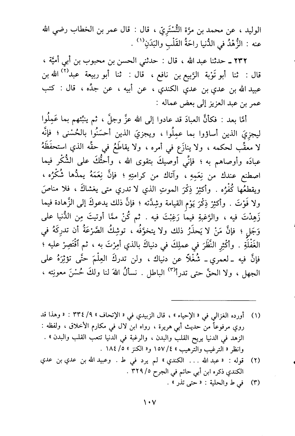218 - حَدَّثَنَا عَبْدُ اللَّهِ، قَالَ: حَدَّثَنِي الْحَسَنُ بْنُ مَحْجُوبِ بْنِ أَبِي أُمَيَّةَ، قَالَ: ثَنَا أَبُو تَوْبَةَ الرَّبِيعُ الْكِنْدِيُّ، قَالَ: ثَنَا أَبُو رَبِيعَةَ عَبْدُ اللَّهِ بْنُ عُبَيْدِ بْنِ عَدِيِّ بْنِ عَدِيٍّ الْكِنْدِيُّ، عَنْ أَبِيهِ، عَنْ جَدِّهِ، قَالَ: كَتَبَ عُمَرُ بْنُ عَبْدِ الْعَزِيزِ إِلَى بَعْضِ عُمَّالِهِ: " أَمَّا بَعْدُ: فَكَأَنَّ الْعِبَادَ قَدْ عَادُوا إِلَى اللَّهِ عَزَّ وَجَلَّ، ثُمَّ §يُنَبِّئُهُمْ بِمَا عَمِلُوا لِيَجْزِيَ الَّذِينَ أَسَاءُوا بِمَا عَمِلُوا وَيَجْزِيَ الَّذِينَ أَحْسَنُوا بِالْحُسْنَى، فَإِنَّهُ لَا مُعَقِّبَ لِحُكْمِهِ، وَلَا يُنَازَعُ فِي أَمْرِهِ، وَلَا يُقَاطَعُ فِي حَقِّهِ الَّذِي اسْتَحْفَظَهُ عِبَادَهُ وَأَوْصَاهُمْ بِهِ، فَإِنِّي أُوصِيكَ بِتَقْوَى اللَّهِ، وَأَحُثُّكَ عَلَى الشُّكْرِ فِيمَا اصْطَنَعَ عِنْدَكَ مِنْ نِعَمِهِ، وَآتَاكَ مِنْ كَرَامَتِهِ، فَإِنَّ نِعَمَهُ يَمُدُّهَا شُكْرُهُ، وَيَقْطَعُهَا كُفْرُهُ. وَأَكْثِرْ ذِكْرَ الْمَوْتِ الَّذِي لَا تَدْرِي مَتَى يَغْشَاكَ، فَلَا مَنَاصَ وَلَا فَوْتَ. وَأَكْثِرْ ذِكْرَ يَوْمِ الْقِيَامَةِ وَشِدَّتَهُ، فَإِنَّ ذَلِكَ يَدْعُوكَ إِلَى الزَّهَادَةِ فِيمَا زَهِدْتَ فِيهِ، وَالرَّغْبَةِ فِيمَا رَغِبْتَ فِيهِ. ثُمَّ كُنْ مِمَّا أُوتِيتَ مِنَ الدُّنْيَا عَلَى وَجَلٍ، فَإِنَّ مَنْ لَا يَحْذَرُ ذَلِكَ وَلَا يَتَخَوَّفُهُ، تُوشِكُ الصَّرْعَةُ أَنْ تُدْرِكَهُ فِي الْغَفْلَةِ. وَأَكْثِرِ النَّظَرَ فِي عَمَلِكَ فِي دُنْيَاكَ بِالَّذِي أُمِرْتَ بِهِ، ثُمَّ اقْتَصِرْ عَلَيْهِ، فَإِنَّ فِيهِ - لَعَمْرِي - شُغْلًا عَنْ دُنْيَاكَ، وَلَنْ تُدْرِكَ الْعِلْمَ حَتَّى تُؤْثِرَهُ عَلَى الْجَهْلِ، وَلَا الْحَقَّ حَتَّى تَدْرَأَ الْبَاطِلَ. نَسْأَلُ اللَّهَ لَنَا وَلَكَ حُسْنَ مَعُونَتَهُ، -[108]- وَأَنْ يَدْفَعَ عَنَّا وَعَنْكَ بِأَحْسَنِ دِفَاعِهِ بِرَحْمَتِهِ "