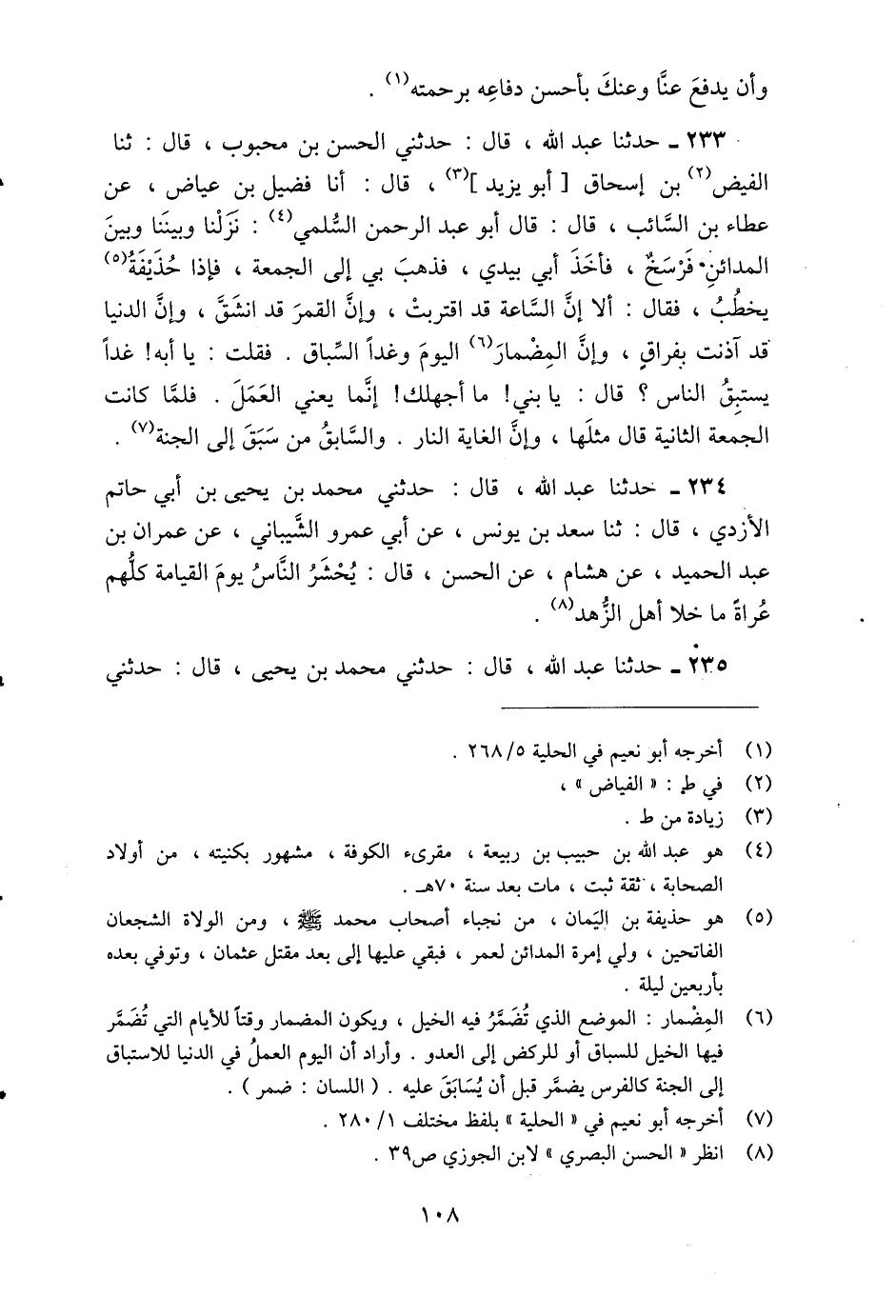 220 - حَدَّثَنَا عَبْدُ اللَّهِ، قَالَ: حَدَّثَنِي مُحَمَّدُ بْنُ يَحْيَى بْنِ أَبِي حَاتِمٍ الْأَزْدِيُّ، قَالَ ثَنَا سَعْدُ بْنُ يُونُسَ، عَنْ أَبِي عَمْرٍو الشَّيْبَانِيِّ، عَنْ عِمْرَانَ بْنِ عَبْدِ الْحَمِيدِ، عَنْ هِشَامٍ، عَنِ الْحَسَنِ، قَالَ: «§يُحْشَرُ النَّاسُ يَوْمَ الْقِيَامَةِ كُلُّهُمْ عُرَاةً مَا خَلَا أَهْلَ الزُّهْدِ»