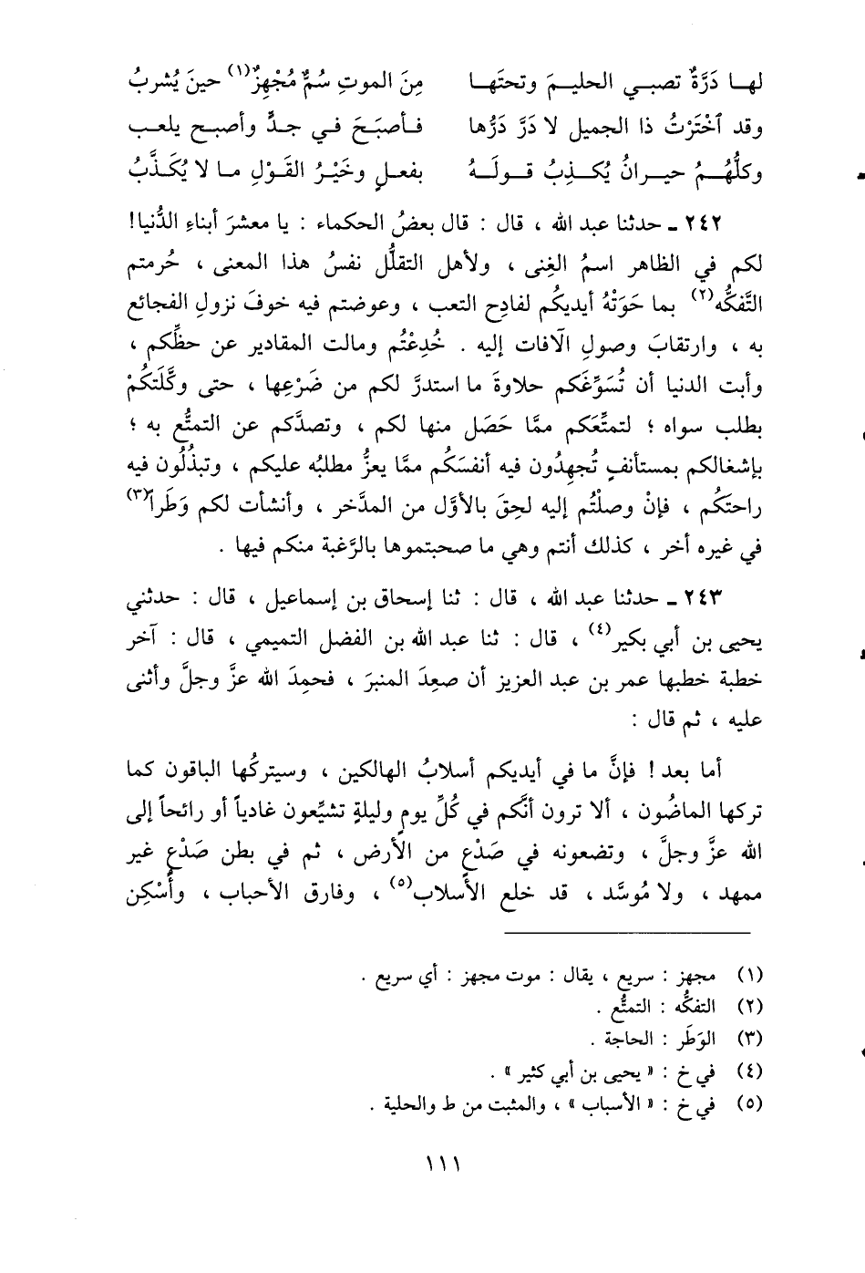 226 - ثنا إِسْحَاقُ بْنُ إِسْمَاعِيلَ، قَالَ: حَدَّثَنِي يَحْيَى بْنُ أَبِي بُكَيْرٍ، قَالَ: ثنا عَبْدُ اللَّهِ بْنُ الْفَضْلِ التَّمِيمِيُّ، قَالَ: آخِرُ خُطْبَةٍ خَطَبَهَا عُمَرُ بْنُ عَبْدِ الْعَزِيزِ أَنْ صَعِدَ الْمِنْبَرَ، فَحَمِدَ اللَّهَ عَزَّ وَجَلَّ وَأَثْنَى عَلَيْهِ، ثُمَّ قَالَ: أَمَّا بَعْدُ فَإِنَّ §مَا فِي أَيْدِيكُمْ أَسْلَابَ الْهَالِكِينَ، وَسَيَتْرُكُهَا الْبَاقُونَ كَمَا تَرَكَهَا الْمَاضُونَ، أَلَا تَرَوْنَ أَنَّكُمْ فِي كُلِّ يَوْمٍ وَلَيْلَةٍ تُشَيِّعُونَ غَادِيًا أَوْ رَائِحًا إِلَى اللَّهِ عَزَّ وَجَلَّ، وَتَضَعُونَهُ فِي صَدْعٍ مِنَ الْأَرْضِ، ثُمَّ فِي بَطْنِ صَدْعٍ غَيْرِ مُمَهَّدٍ، وَلَا مُوَسَّدٍ، قَدْ خَلَعَ الْأَسْلَابَ، وَفَارَقَ الْأَحْبَابَ، وَأُسْكِنَ -[112]- التُّرَابَ، وَوَاجَهَ الْحِسَابَ، فَقِيرًا إِلَى مَا قَدَّمَ أَمَامَهُ، غَنِيًّا عَمَّا تَرَكَ بَعْدَهُ «أَمَا وَاللَّهِ إِنِّي لَأَقُولُ لَكُمْ هَذَا وَمَا أَعْرِفُ مِنْ أَحَدٍ مِنَ النَّاسِ مِثْلَ مَا أَعْرِفُ مِنْ نَفْسِي» قَالَ: ثُمَّ مَالَ بِطَرْفِ ثَوْبِهِ عَلَى عَيْنِهِ فَبَكَى، ثُمَّ نَزَلَ فَمَا خَرَجَ حَتَّى أُخْرِجَ إِلَى حُفْرَتِهِ