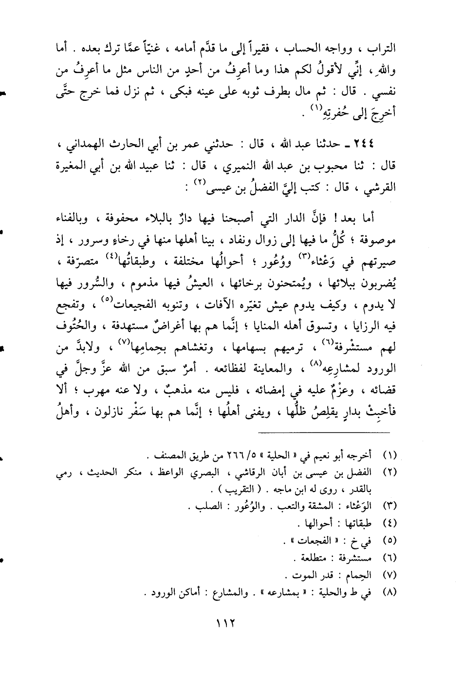 227 - حَدَّثَنِي عُمَرُ بْنُ أَبِي الْحَارِثِ الْهَمْدَانِيُّ، قَالَ: ثنا مَحْبُوبُ بْنُ عَبْدِ اللَّهِ النُّمَيْرِيُّ، قَالَ: ثنا عُبَيْدُ اللَّهِ بْنُ أَبِي الْمُغِيرَةِ الْقُرَشِيُّ، قَالَ: كَتَبَ إِلَيَّ الْفَضْلُ بْنُ عِيسَى: " أَمَّا بَعْدُ، فَإِنَّ §الدَّارَ الَّتِي أَصْبَحْنَا فِيهَا دَارٌ بِالْبَلَاءِ مَحْفُوفَةٌ، وَبِالْفَنَاءِ مَوْصُوفَةٌ، كُلُّ مَا فِيهَا إِلَى زَوَالٍ وَنَفَادٍ، بَيْنَا أَهْلُهَا مِنْهَا فِي رَخَاءٍ وَسُرُورٍ، إِذْ صَيَّرَتْهُمْ فِي وَعْثَاءٍ وَوُعُورٍ، أَحْوَالُهَا مُخْتَلِفَةٌ، وَطَبَقَاتُهَا مُتَصَرِّفَةٌ، يُضْرَبُونَ بِبَلَائِهَا، وَيُمْتَحَنُونَ بِرَخَائِهَا، الْعَيْشُ فِيهَا مَذْمُومٌ، وَالسُّرُورُ فِيهَا لَا يَدُومُ، وَكَيْفَ يَدُومُ عَيْشٌ تَغَيُّرُهُ الْآفَاتُ، وَتَنُوبُهُ الْفَجِيعَاتُ، وَتَفَجَّعُ فِيهِ الرَّزَايَا، وَتَسُوقُ أَهْلُهُ الْمَنَايَا، إِنَّمَا هُمْ بِهَا أَغْرَاضٌ مُسْتَهْدَفَةٌ، وَالْحُتُوفُ لَهُمْ مُسْتَشْرِفَةٌ، تَرْمِيهِمْ بِسِهَامِهَا، وَتَغْشَاهُمْ بِحِمَامِهَا، وَلَا بُدَّ مِنَ الْوُرُودِ لُمُشَارِعِهِ، وَالْمُعَايَنَةِ لِفَظَائِعِهِ أَمْرٌ سَبَقَ مِنَ اللَّهِ عَزَّ وَجَلَّ فِي قَضَائِهِ وَعَزَمَ عَلَيْهِ فِي إِمْضَائِهِ، فَلَيْسَ مِنْهُ مَذْهَبٌ، وَلَا عَنْهُ مَهْرَبٌ، أَلَا فَأَخْبِثْ بِدَارٍ يَقْلِصُ ظِلُّهَا، وَيَفْنَى أَهْلُهَا، إِنَّمَا هُمْ بِهَا سَفْرٌ نَازِلُونَ، وَأَهْلُ -[113]- ظَعْنٍ شَاخِصُونَ، كَأَنْ قَدِ انْقَلَبَتْ بِهِمُ الْحَالُ، وَتَنَادَوْا بِالِارْتِحَالِ، فَأَصْبَحَتْ مِنْهُمْ قِفَارًا قَدِ انْهَارَتْ دَعَائِمُهَا، وَتَنَكَّرَتْ مَعَالِمُهَا، وَاسْتَبْدَلُوا بِهَا الْقُبُورَ الْمُوحِشَةَ الَّتِي اسْتُوطِنَتْ بِالْخَرَابِ، وَأُسِّسَتْ بِالتُّرَابِ، فَمُحِلُّهَا مُقْتَرِبٌ، وَسَاكِنُهَا مُغْتَرِبٌ بَيْنَ أَهْلٍ مُوحِشِينَ، وَذَوِي مَحَلَّةٍ مُتَشَاسِعِينَ، لَا يَسْتَأْنِسُونَ بِالْعُمْرَانِ، وَلَا يَتَوَاصَلُونَ تَوَاصُلَ الْإِخْوَانِ، وَلَا يَتَزَاوَرُونَ تَزَاوُرَ الْجِيرَانِ، قَدِ اقْتَرَبُوا فِي الْمَنَازِلِ، وَتَشَاغَلُوا عَنِ التَّوَاصُلِ، فَلَمْ أَرَ مِثْلَهُمْ جِيرَانَ مَحَلَّةٍ لَا يَتَزَاوَرُونَ عَلَى مَا بَيْنَهُمْ مِنَ الْجِوَارِ وَتَقَارُبِ الدِّيَارِ، وَأَنَّى ذَلِكَ مِنْهُمْ؟ وَقَدْ طَحَنَهُمْ بِكَلْكَلِهِ الْبِلَى، وَأَكَلَتْهُمُ الْجَنَادِلُ وَالثَّرَى، وَصَارُوا بَعْدَ الْحَيَاةِ رُفَاتًا، قَدْ فُجِعَ بِهِمُ الْأَحْبَابُ، وَارْتُهِنُوا فَلَيْسَ لَهُمْ إِيَابٌ، وَكَأَنْ قَدْ صِرْنَا إِلَى مَا إِلَيْهِ صَارُوا، فَنُرْتَهَنُ فِي ذَلِكَ الْمَضْجَعِ، وَيَضُمُّنَا ذَلِكَ الْمُسْتَوْدَعُ، نُؤْخَذُ بِالْقَهْرِ وَالِاعْتِسَارِ، وَلَيْسَ يَنْفَعُ مِنْهُ شَفَقُ الْحِذَارِ، وَالسَّلَامُ قَالَ: قُلْتُ لَهُ: بِأَيِّ شَيْءٍ كَتَبْتَ إِلَيْهِ؟ قَالَ: لَمْ أَقْدِرْ لَهُ عَلَى جَوَابٍ