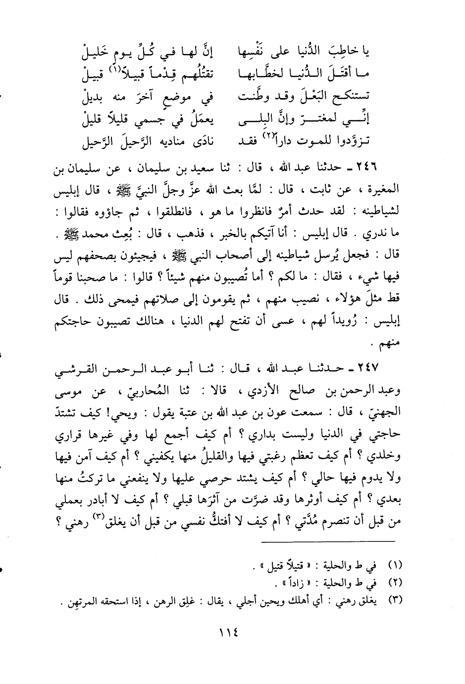229 - ثنا سَعِيدُ بْنُ سُلَيْمَانَ، عَنْ سُلَيْمَانَ بْنِ الْمُغِيرَةِ، عَنْ ثَابِتٍ، قَالَ: لَمَّا بَعَثَ اللَّهُ عَزَّ وَجَلَّ النَّبِيَّ صَلَّى اللَّهُ عَلَيْهِ وَسَلَّمَ، قَالَ إِبْلِيسُ لِشَيَاطِينِهِ: لَقَدْ حَدَثَ أَمْرٌ فَانْظُرُوا مَا هُوَ، فَانْطَلَقُوا، ثُمَّ جَاءُوهُ فَقَالُوا: مَا نَدْرِي، قَالَ إِبْلِيسُ: أَنَا آتَيْتُكُمْ بِالْخَبَرِ، فَذَهَبَ قَالَ: §بُعِثَ مُحَمَّدٌ صَلَّى اللَّهُ عَلَيْهِ وَسَلَّمَ قَالَ: فَجَعَلَ يُرْسِلُ شَيَاطِينَهُ إِلَى أَصْحَابِ النَّبِيِّ صَلَّى اللَّهُ عَلَيْهِ وَسَلَّمَ فَيَجِيئُونَ بِصُحُفِهِمْ لَيْسَ فِيهَا شَيْءٌ، فَقَالَ: مَا لَكُمْ؟ أَمَا تُصِيبُونَ مِنْهُمْ شَيْئًا؟ قَالُوا: مَا صَحِبْنَا قَوْمًا قَطُّ مِثْلَ هَؤُلَاءِ، نُصِيبُ مِنْهُمْ ثُمَّ يَقُومُونَ إِلَى صَلَاتِهِمْ فَيُمْحَى ذَلِكَ. قَالَ إِبْلِيسُ: رُوَيْدًا لَهُمْ، عَسَى أَنْ تُفْتَحَ لَهُمُ الدُّنْيَا، هُنَالِكَ تُصِيبُونَ حَاجَتَكُمْ مِنْهُمْ