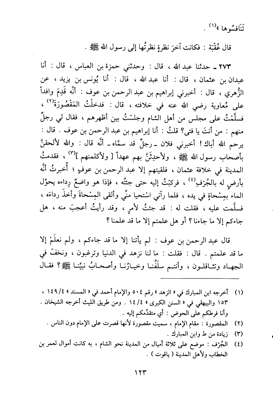 252 - وَحَدَّثَنِي حَمْزَةُ بْنُ الْعَبَّاسِ، قَالَ: أنا عَبْدَانُ بْنُ عُثْمَانَ، قَالَ: أنا عَبْدُ اللَّهِ، قَالَ: أنا يُونُسُ بْنُ يَزِيدَ، عَنِ الزُّهْرِيِّ، قَالَ: أَخْبَرَنِي إِبْرَاهِيمُ بْنُ عَبْدِ الرَّحْمَنِ بْنِ عَوْفٍ، أَنَّهُ قَدِمَ وَافِدًا عَلَى مُعَاوِيَةَ رَضِيَ اللَّهُ عَنْهُ فِي خِلَافَتِهِ قَالَ: فَدَخَلْتُ الْمَقْصُورَةَ فَسَلَّمْتُ عَلَى مَجْلِسٍ مِنْ أَهْلِ الشَّامِ، وَجَلَسْتُ بَيْنَ أَظْهُرِهِمْ، فَقَالَ لِي رَجُلٌ مِنْهُمْ: مَنْ أَنْتَ يَا فَتَى؟ قُلْتُ: أَنَا إِبْرَاهِيمُ بْنُ عَبْدِ الرَّحْمَنِ بْنِ عَوْفٍ. قَالَ: يَرْحَمُ اللَّهُ أَبَاكَ أَخْبَرَنِي فُلَانٌ رَجُلٌ قَدْ سَمَّاهُ أَنَّهُ قَالَ: وَاللَّهِ لَأَلْحَقَنَّ بِأَصْحَابِ رَسُولِ اللَّهِ صَلَّى اللَّهُ عَلَيْهِ وَسَلَّمَ، وَلَأُحْدِثَنَّ بِهِمْ عَهْدًا وَلَأُكَلِّمَنَّهُمْ، فَقَدِمْتُ الْمَدِينَةَ فِي خِلَافَةِ عُثْمَانَ، فَلَقِيتُهُمْ إِلَّا عَبْدَ الرَّحْمَنِ بْنَ عَوْفٍ، أُخْبِرْتُ أَنَّهُ بِأَرْضٍ لَهُ بِالْجُرْفِ، فَرَكِبْتُ إِلَيْهِ حَتَّى جِئْتُهُ، فَإِذَا هُوَ وَاضِعٌ رِدَاءَهُ يُحَوِّلُ الْمَاءَ بِمِسْحَاةٍ فِي يَدِهِ، فَلَمَّا رَآنِي اسْتَحْيَا مِنِّي وَأَلْقَى الْمِسْحَاةَ، وَأَخَذَ رِدَاءَهُ، فَسَلَّمْتُ عَلَيْهِ، فَقُلْتُ لَهُ: قَدْ جِئْتُ لِأَمْرٍ، وَقَدْ رَأَيْتُ أَعْجَبَ مِنْهُ، هَلْ جَاءَكُمْ إِلَّا مَا جَاءَنَا؟ أَوْ هَلْ عَلِمْتُمْ إِلَّا مَا قَدْ عَلِمْنَا؟ . قَالَ عَبْدُ الرَّحْمَنِ بْنُ عَوْفٍ: «لَمْ يَأْتِنَا إِلَّا مَا قَدْ جَاءَكُمْ، وَلَمْ نَعْلَمْ إِلَّا مَا قَدْ عَلِمْتُمْ» . قَالَ: فَقُلْتُ: مَا لَنَا نَزْهَدُ فِي الدُّنْيَا وَتَرْغَبُونَ، وَنَخُفُّ فِي الْجِهَادِ وَتَثَاقَلُونَ، وَأَنْتُمْ سَلَفُنَا وَخِيَارُنَا وَأَصْحَابُ نَبِيِّنَا صَلَّى اللَّهُ عَلَيْهِ وَسَلَّمَ؟ فَقَالَ -[124]- عَبْدُ الرَّحْمَنِ: «لَمْ يَأْتِنَا إِلَّا مَا قَدْ جَاءَكُمْ، وَلَمْ نَعْلَمْ إِلَّا مَا قَدْ عَلِمْتُمْ، لَكِنَّا §بُلِينَا بِالضَّرَّاءِ مَعَ رَسُولِ اللَّهِ فَصَبَرْنَا، وَبُلِينَا بِالسَّرَّاءِ فَلَمْ نَصْبِرْ»