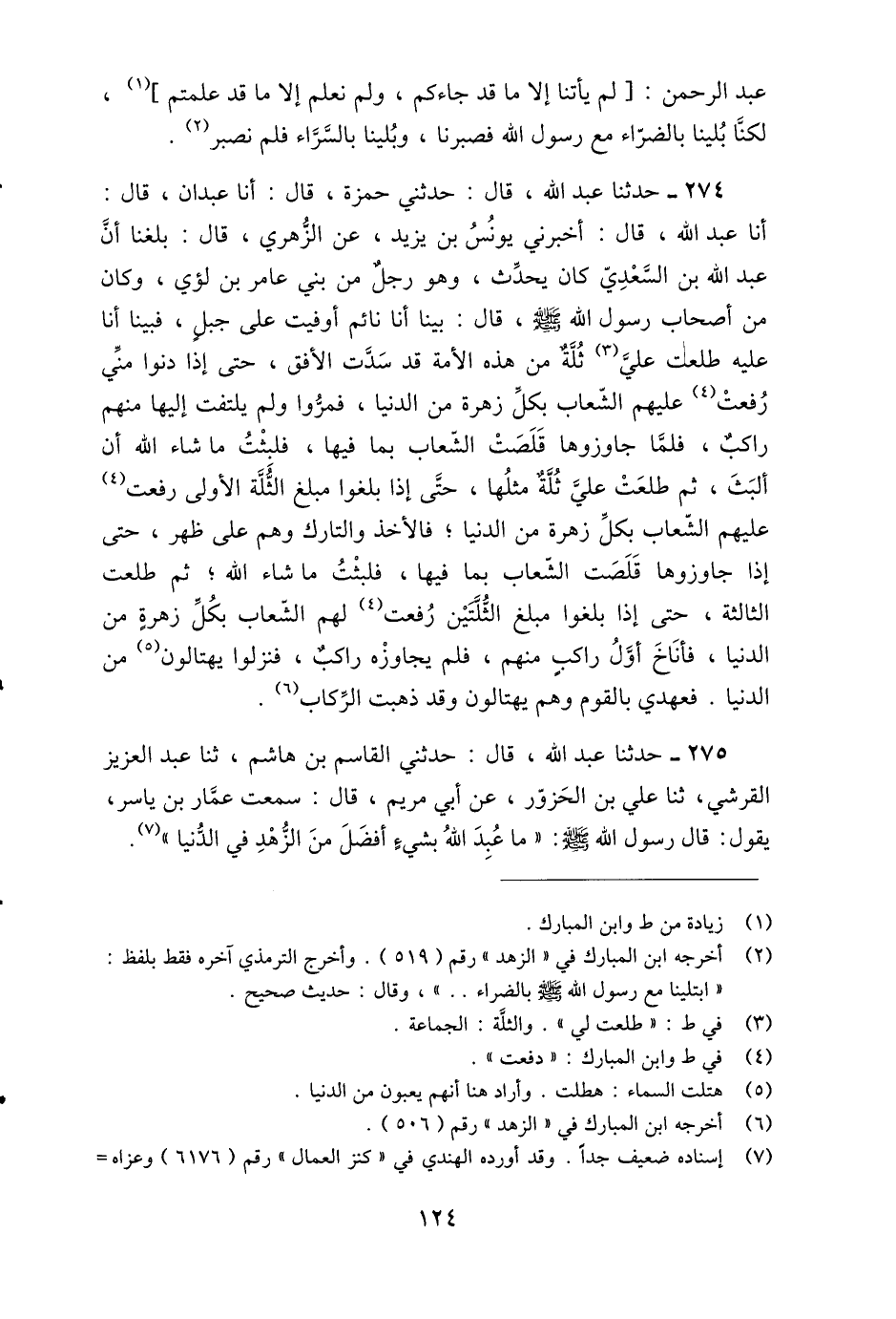 253 - حَدَّثَنِي حَمْزَةُ، قَالَ: أنا عَبْدَانُ، قَالَ: أنا عَبْدُ اللَّهِ، قَالَ: أَخْبَرَنِي يُونُسُ بْنُ يَزِيدَ، عَنِ الزُّهْرِيِّ، قَالَ: بَلَغَنَا أَنَّ عَبْدَ اللَّهِ بْنَ السَّعْدِيِّ كَانَ يُحَدِّثُ، وَهُوَ رَجُلٌ مِنْ بَنِي عَامِرِ بْنِ لُؤَيٍّ، وَكَانَ مِنْ أَصْحَابِ رَسُولِ اللَّهِ صَلَّى اللَّهُ عَلَيْهِ وَسَلَّمَ قَالَ: «§بَيْنَا أَنَا نَائِمٌ أَوْفَيْتُ عَلَى جَبَلٍ، فَبَيْنَا أَنَا عَلَيْهِ طَلَعَتْ عَلَيَّ ثُلَّةٌ مِنْ هَذِهِ الْأُمَّةِ قَدْ سَدَّتِ الْأُفُقَ، حَتَّى إِذَا دَنَوْا مِنِّي رُفِعَتْ عَلَيْهِمُ الشِّعَابُ بِكُلِّ زَهْرَةٍ مِنَ الدُّنْيَا، فَمَرُّوا وَلَمْ يَلْتَفِتْ إِلَيْهَا مِنْهُمْ رَاكِبٌ، فَلَمَّا جَاوَزُوهَا قَلَصَتِ الشِّعَابُ بِمَا فِيهَا، فَلَبِثْتُ مَا شَاءَ اللَّهُ أَنْ أَلْبَثَ، ثُمَّ طَلَعَتْ عَلَيَّ ثُلَّةٌ مِثْلُهَا، حَتَّى إِذَا بَلَغُوا مَبْلَغَ الثُّلَّةِ الْأُولَى رُفِعَتْ عَلَيْهِمُ الشِّعَابُ بِكُلِّ زَهْرَةٍ مِنَ الدُّنْيَا، فَالْآخِذُ وَالتَّارِكُ وَهُمْ عَلَى ظَهْرٍ، حَتَّى إِذَا جَاوَزُوهَا قَلَصَتِ الشِّعَابُ بِمَا فِيهَا، فَلَبِثْتُ مَا شَاءَ اللَّهُ، ثُمَّ طَلَعَتِ الثَّالِثَةُ، حَتَّى إِذَا بَلَغُوا مَبْلَغَ الثُّلَّتَيْنِ رُفِعَتْ لَهُمُ الشِّعَابُ بِكُلِّ زَهْرَةٍ مِنَ الدُّنْيَا، فَأَنَاخَ أَوَّلُ رَاكِبٍ مِنْهُمْ، فَلَمْ يُجَاوِزْهُ رَاكِبٌ، فَنَزَلُوا يَهْتَالُونَ مِنَ الدُّنْيَا، فَعَهْدِي بِالْقَوْمِ وَهُمْ يَهْتَالُونَ وَقَدْ ذَهَبَتِ الرِّكَابُ»