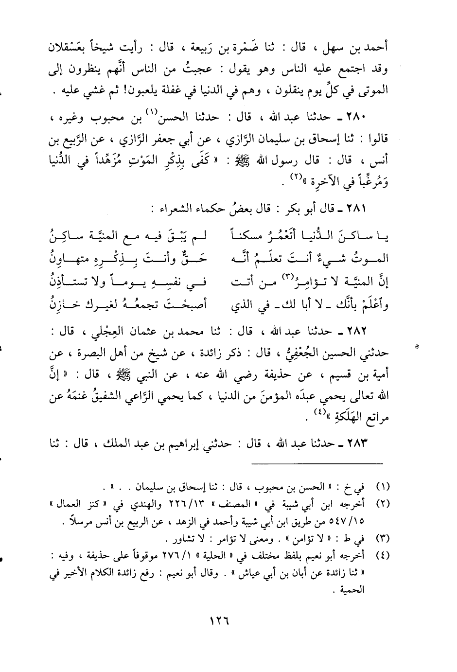 260 - ثنا مُحَمَّدُ بْنُ عُثْمَانَ الْعِجْلِيُّ، قَالَ: حَدَّثَنِي الْحُسَيْنُ الْجُعْفِيُّ، قَالَ: ذَكَرَ زَائِدَةُ عَنْ شَيْخٍ مِنْ أَهْلِ الْبَصْرَةِ عَنْ أُمَيَّةَ بْنِ قُسَيْمٍ، عَنْ حُذَيْفَةَ، رَضِيَ اللَّهُ عَنْهُ، عَنِ النَّبِيِّ صَلَّى اللَّهُ عَلَيْهِ وَسَلَّمَ قَالَ: «إِنَّ §اللَّهَ تَعَالَى يَحْمِي عَبْدَهُ الْمُؤْمِنَ مِنَ الدُّنْيَا، كَمَا يَحْمِي الرَّاعِي الشَّفِيقُ غَنَمَهُ عَنْ مَرَاتِعِ الْهَلَكَةِ»