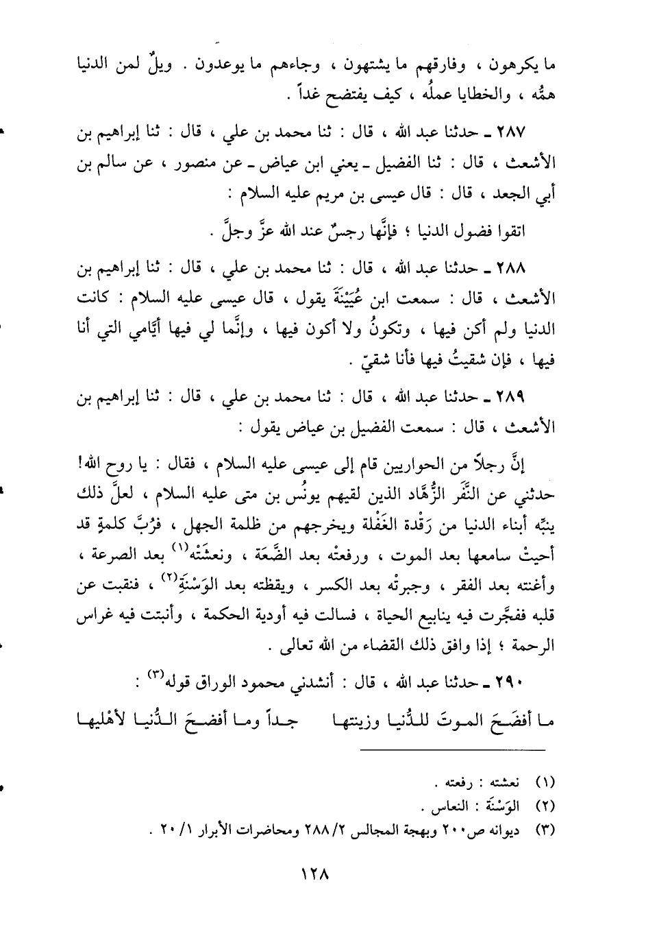 267 - ثنا مُحَمَّدُ بْنُ عَلِيٍّ، قَالَ: ثنا إِبْرَاهِيمُ بْنُ الْأَشْعَثِ، قَالَ: سَمِعْتُ الْفُضَيْلَ بْنَ عِيَاضٍ، يَقُولُ: إِنَّ رَجُلًا مِنَ الْحَوَارِيِّينَ قَامَ إِلَى عِيسَى عَلَيْهِ السَّلَامُ، فَقَالَ: يَا رُوحَ اللَّهِ حَدِّثْنِي عَنِ النَّفْرِ الزُّهَّادِ الَّذِينَ لَقِيَهُمْ يُونُسُ بْنُ مَتَّى عَلَيْهِ السَّلَامُ، لَعَلَّ ذَلِكَ يُنَبِّهُ أَبْنَاءَ الدُّنْيَا مِنْ رَقْدَةِ الْغَفْلَةِ، وَيُخْرِجُهُمْ مِنْ ظُلْمَةِ الْجَهْلِ، §فَرُبَّ كَلِمَةٍ قَدْ أَحْيَتْ سَامِعَهَا بَعْدَ الْمَوْتِ، وَرَفَعَتْهُ بَعْدَ الضَّعَةِ، وَنَعَشَتْهُ بَعْدَ الصَّرْعَةِ، وَأَغْنَتْهُ بَعْدَ الْفَقْرِ، وَجَبَرَتْهُ بَعْدَ الْكَسْرِ، وَيَقَّظَتْهُ بَعْدَ الْوَسْنَةِ، فَنَقَّبَتْ عَنْ قَلْبِهِ فَفَجَّرَتْ فِيهِ يَنَابِيعَ الْحَيَاةِ، فَسَالَتْ فِيهِ أَوْدِيَةُ الْحِكْمَةِ، وَأَنْبَتَتْ فِيهِ غِرَاسُ الرَّحْمَةِ، إِذَا وَافَقَ ذَلِكَ الْقَضَاءَ مِنَ اللَّهِ تَعَالَى أَنْشَدَنِي مَحْمُودٌ الْوَرَّاقُ قَوْلَهُ: